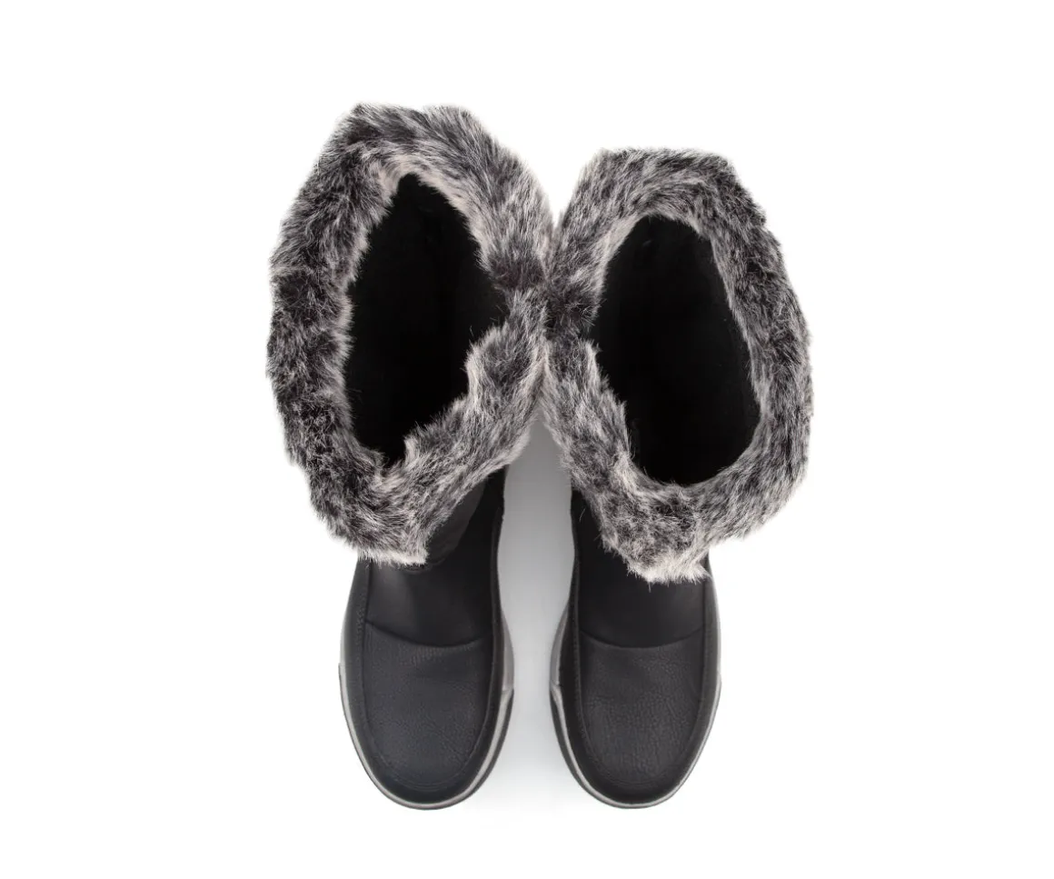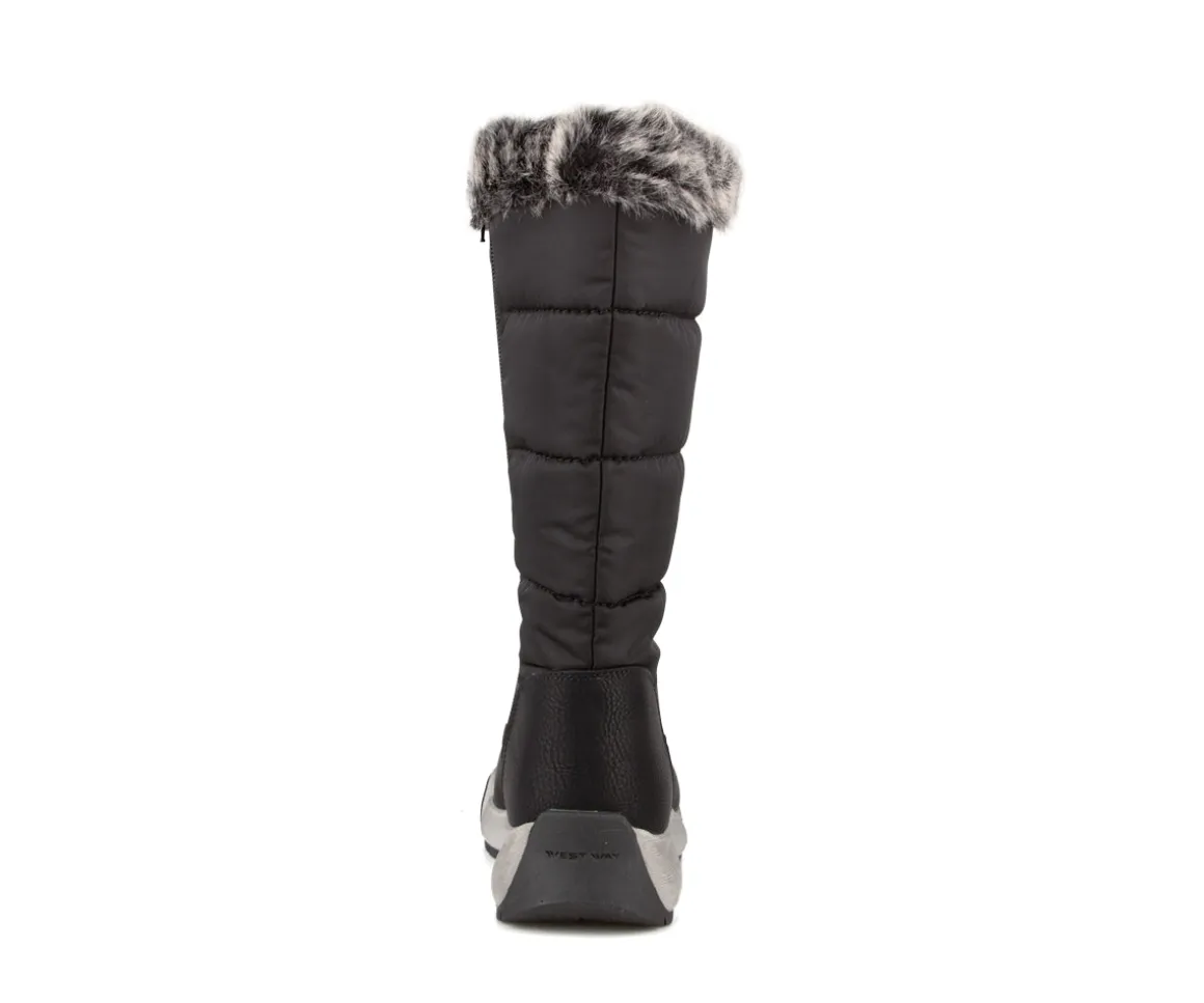 Ces bottes d’hiver hautes West Way pour femmes offrent chaleur, confort et protection contre l’humidité. Imperméables grâce à la membrane Aquatex, elles sont fabriquées en cuir synthétique et nylon avec un collet en fourrure. La doublure en laine synthétique et la semelle intérieure amovible en feutre assurent confort et isolation, tandis que la semelle extérieure en TPR antidérapante garantit stabilité sur les surfaces glissantes. Hauteur du talon : 1,5 pouces.