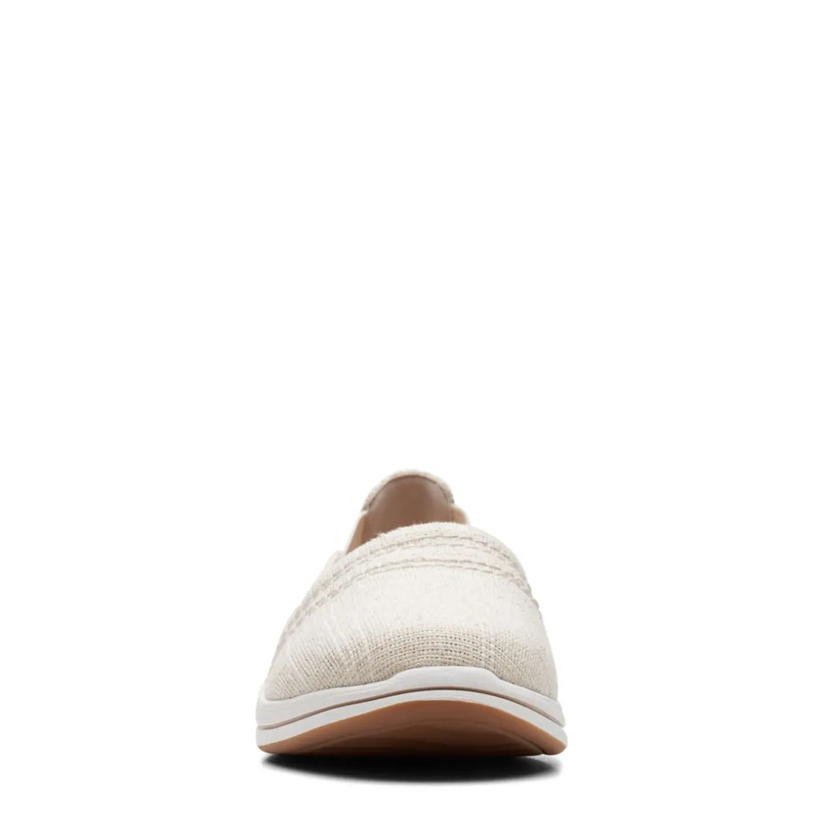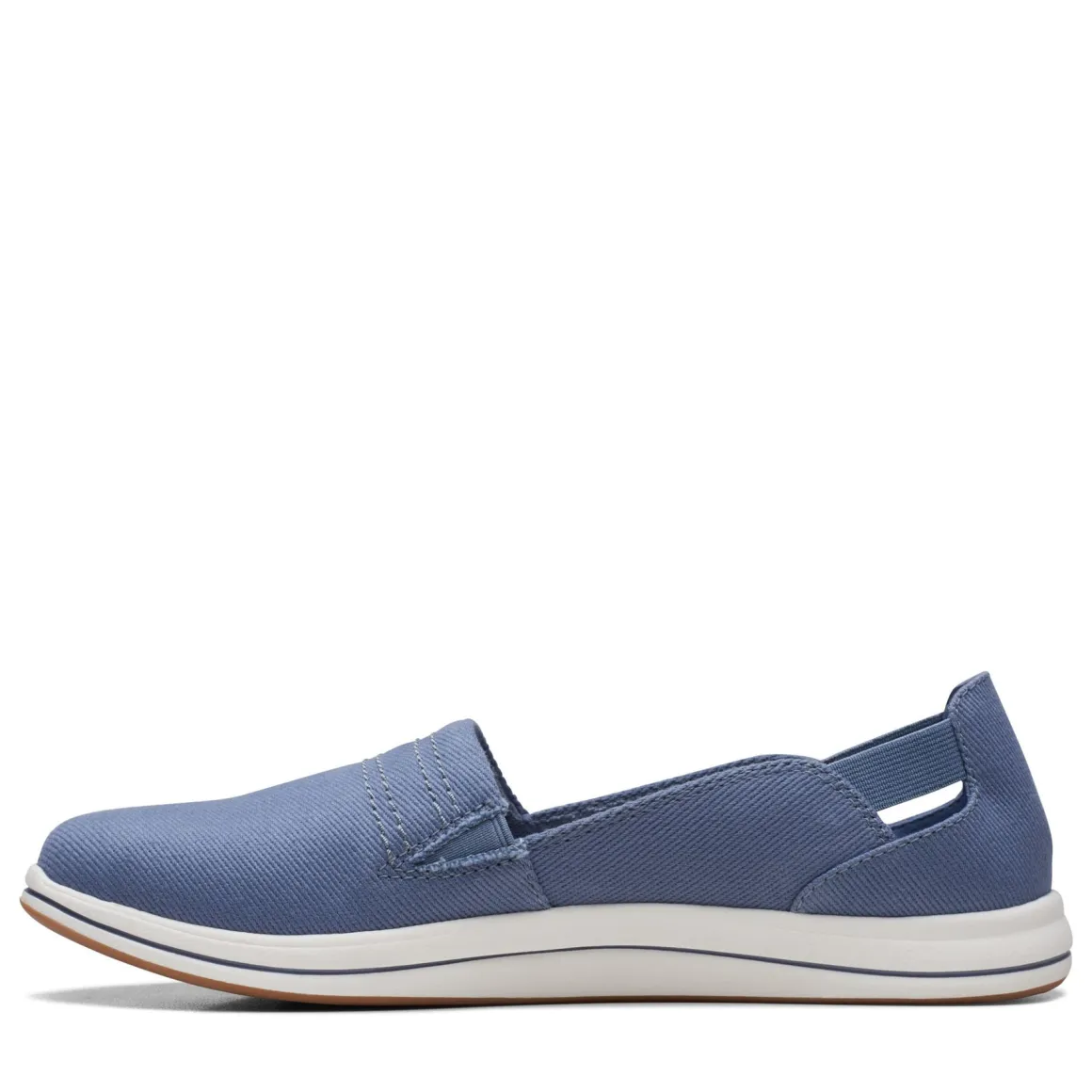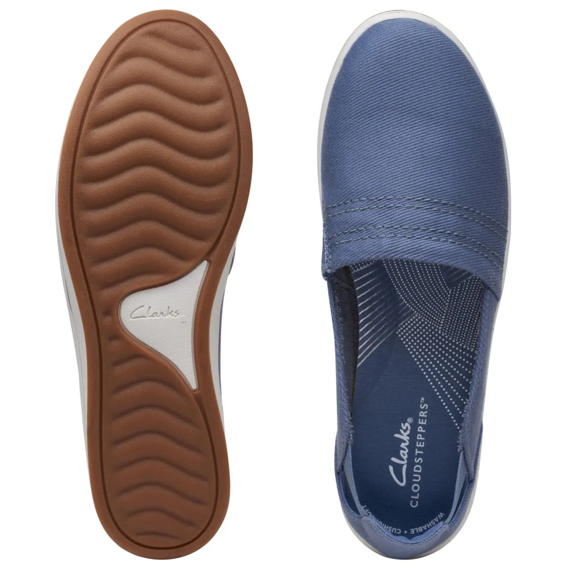 Chaussures de type flâneur Clarks Breeze step pour femmes. Chaque pas est plus confortable grâce à l’amorti sous le pied, et la tige en toile extensible offre un ajustement sûr. Disponible dans trois couleurs (noir, beige et bleu).
