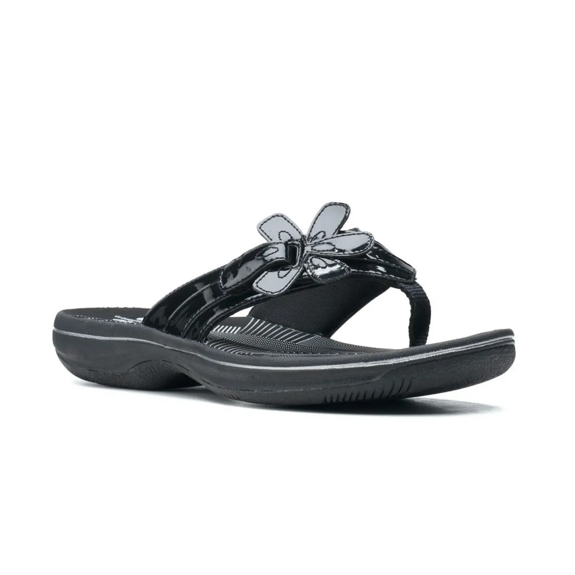 Sandales tongs Brinkley Flora de Clarks pour femmes, ornées d’une fleur décorative et équipées d’une fermeture velcro pour un ajustement optimal. Profitez de vos promenades sur la plage avec un confort inégalé.