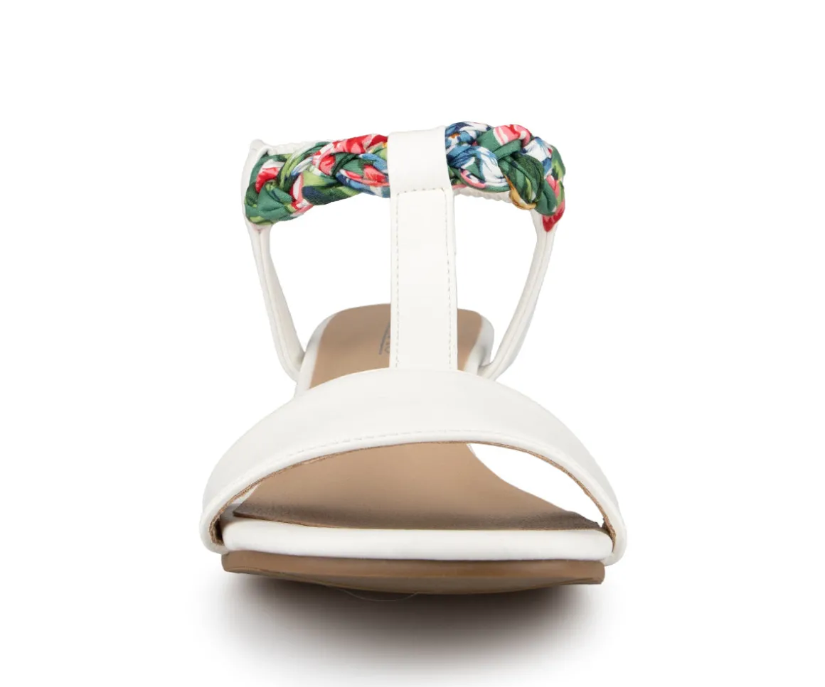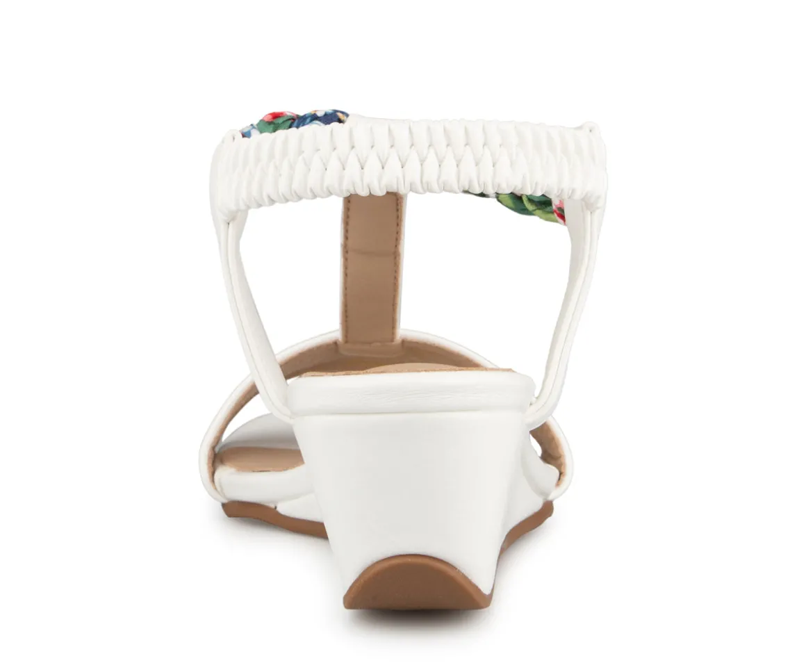 Sandale à talon compensé Alberto pour femme avec courroie en T et élastique à motif floral sur la cheville. Ces sandales sont parfaites pour les occasions spéciales comme les mariages, les galas ou les soirées cocktail. Disponible dans deux couleurs (blanc ou noir).