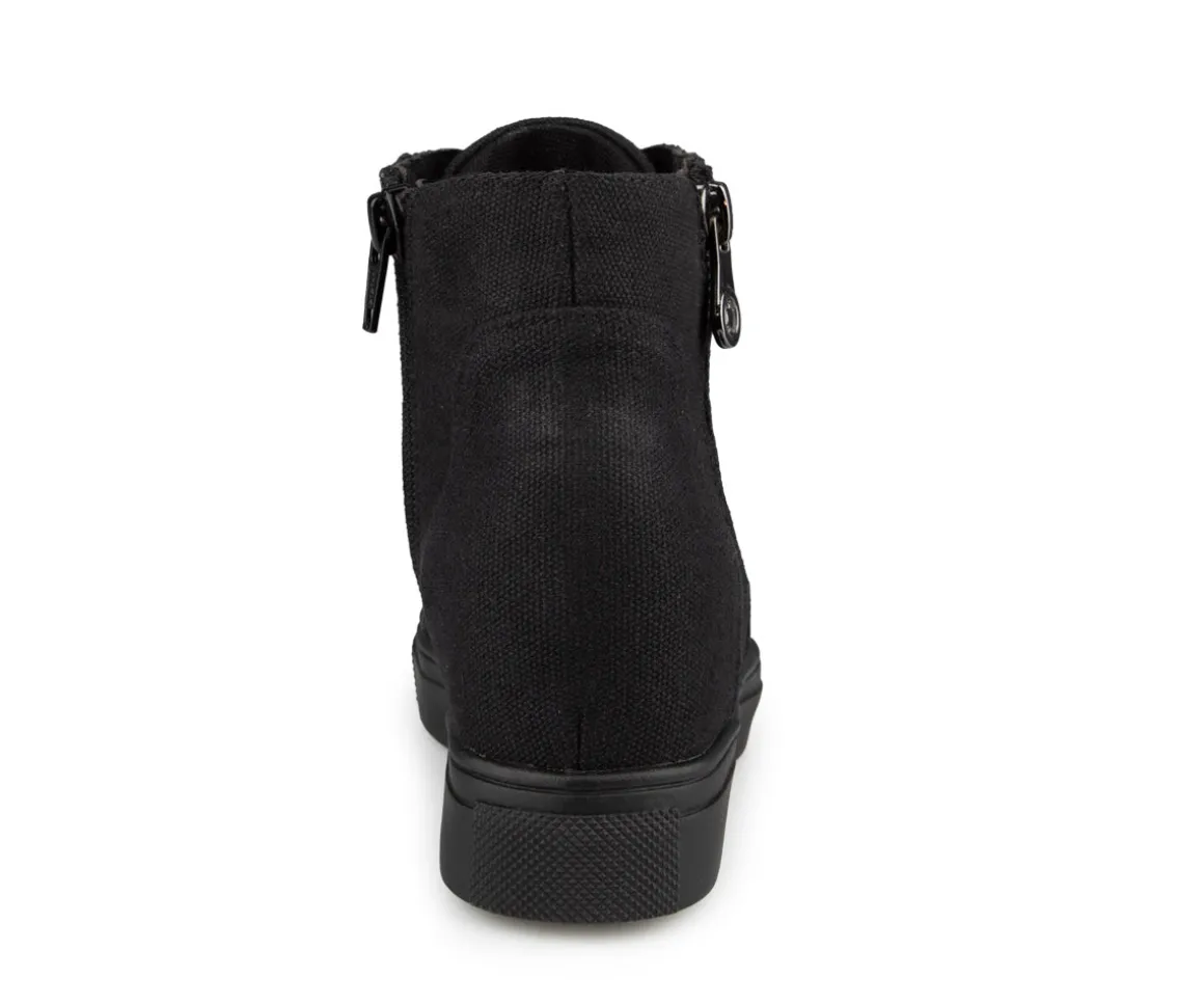 Chaussures en toile à talon compensé caché avec élastique et fermeture éclair. Disponible dans deux couleurs (noir et multicolore).
