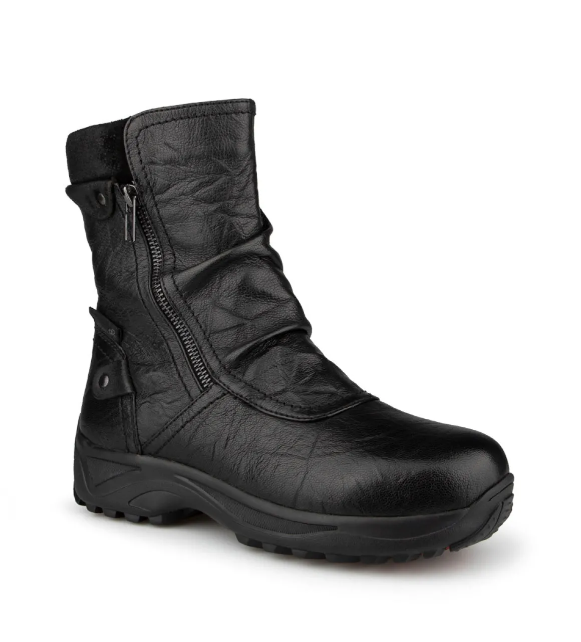 Explorez l’hiver avec nos bottillons doublés à crampons et fermeture éclair. Construction en cuir avec talon plat plein et confortable, double fermeture YKK, laine mix et système de crampons pour une stabilité optimale sur les surfaces glissantes.