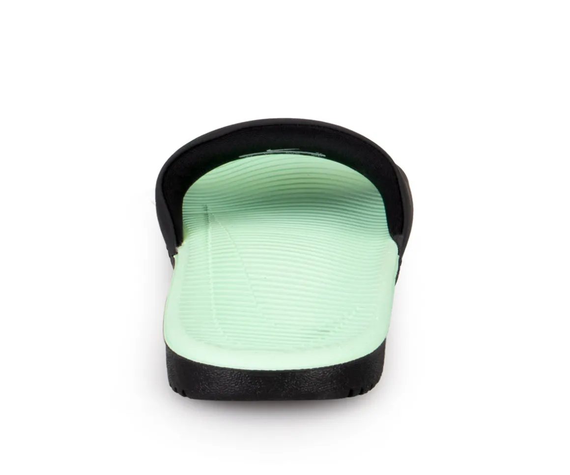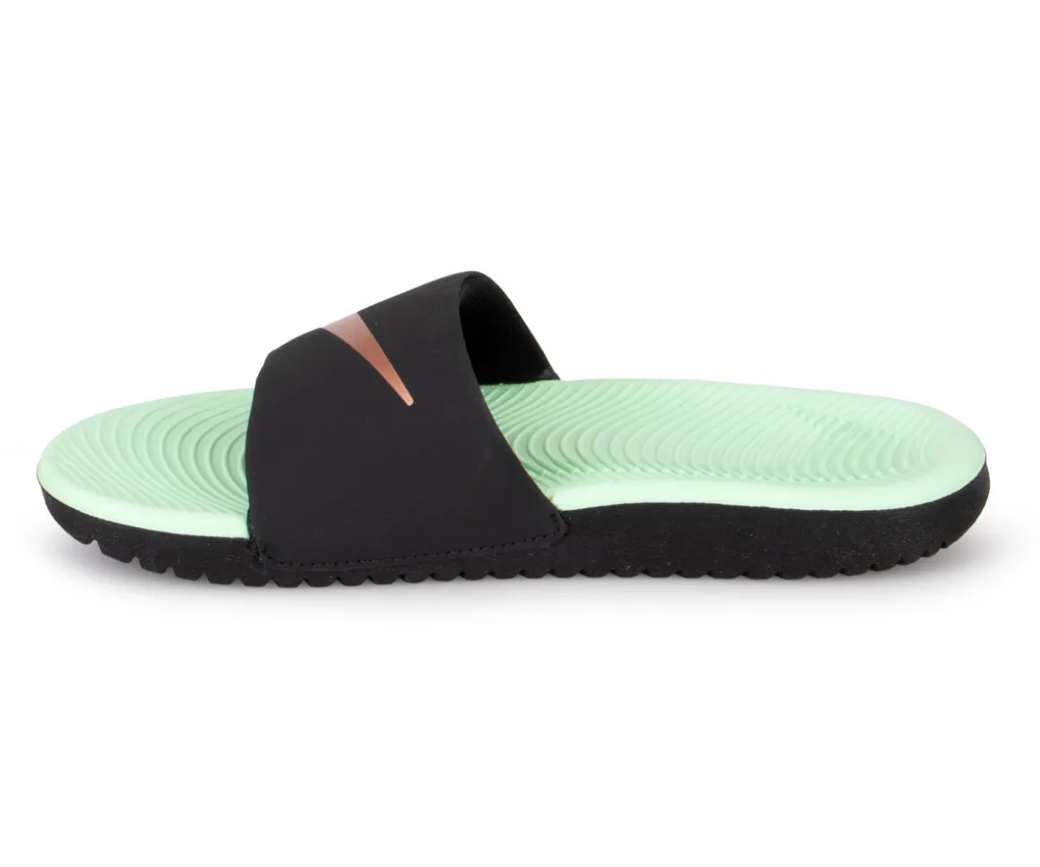 Sandales Nike Kawa pour filles noires avec intérieur turquoise et logo or sur le dessus. Dotées d’une sangle souple en matériaux synthétiques, ces sandales offrent un confort optimal. Leur semelle extérieure en mousse légère assure légèreté et souplesse pour une expérience agréable à chaque pas. Elles deviendront vite leur préféré.