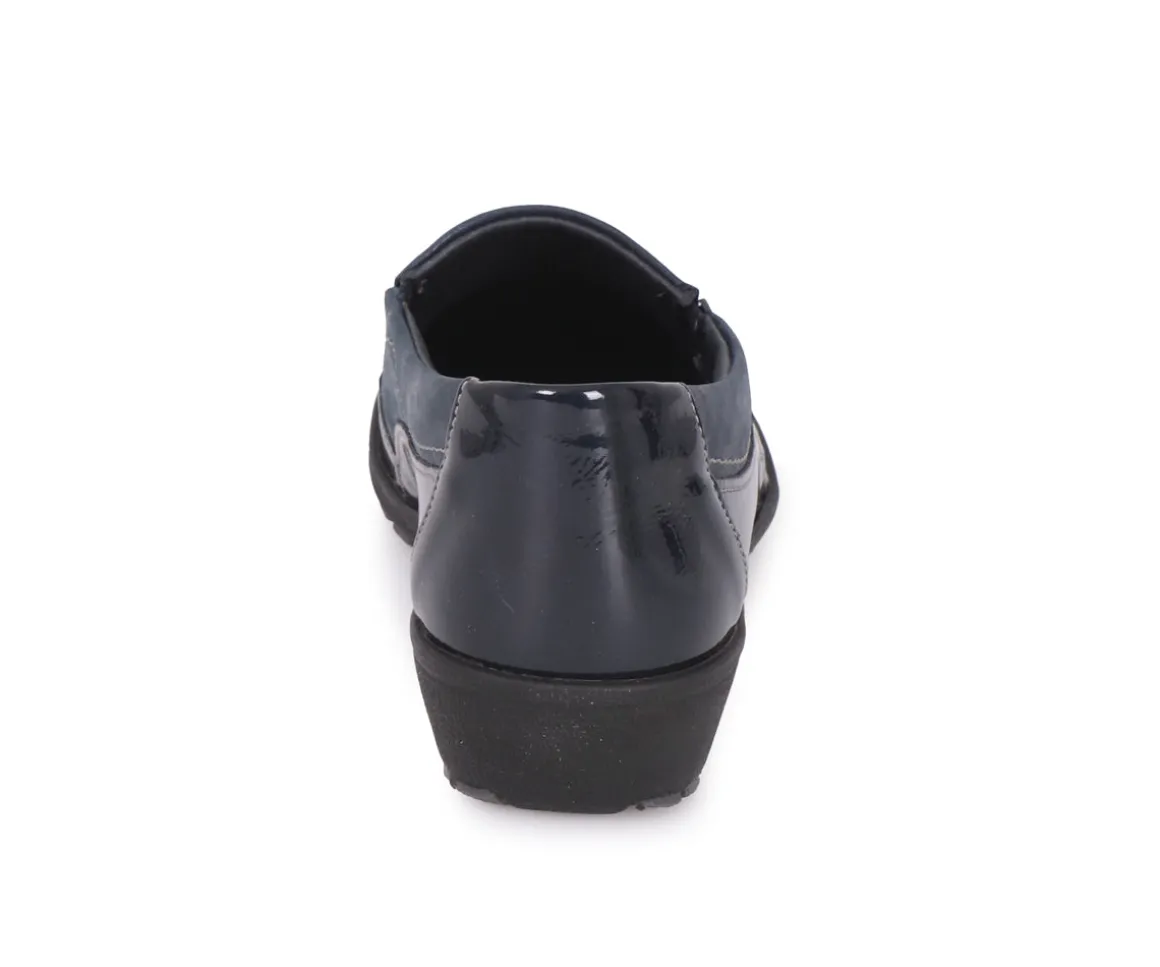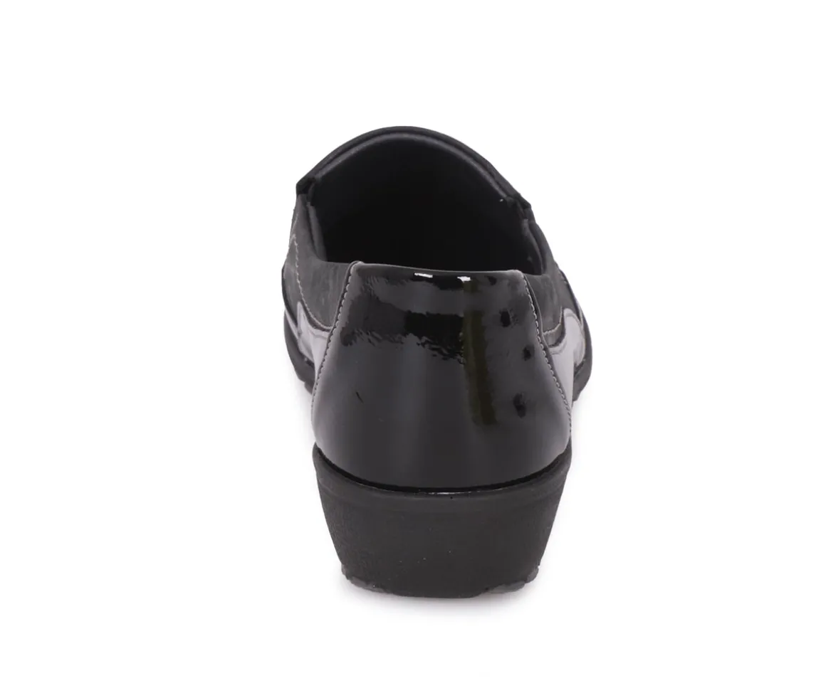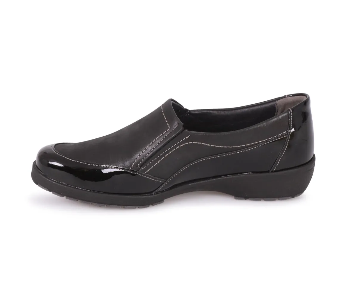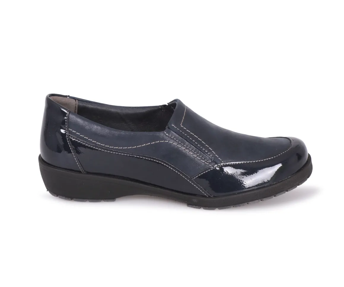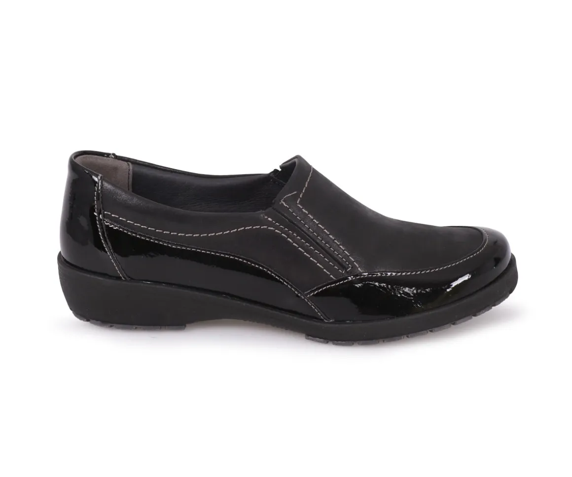 Ces souliers en cuir Suave pour femmes sont dotés d’élastiques sur l’empeigne pour un enfilage facile. Le talon compensé et la largeur B assurent un confort optimal, tandis que la semelle extérieure en TPR offre une bonne adhérence, faisant de ces souliers un choix pratique et élégant pour un usage quotidien.