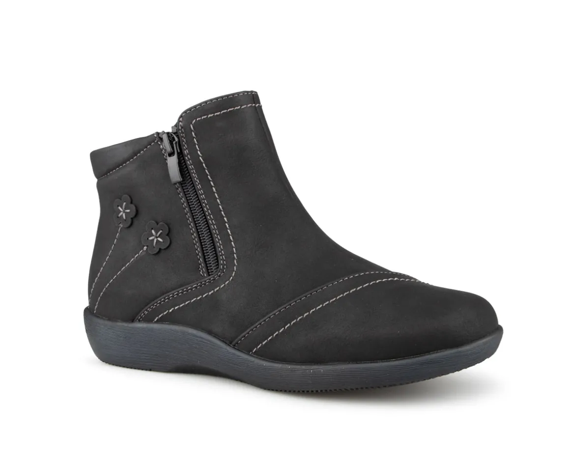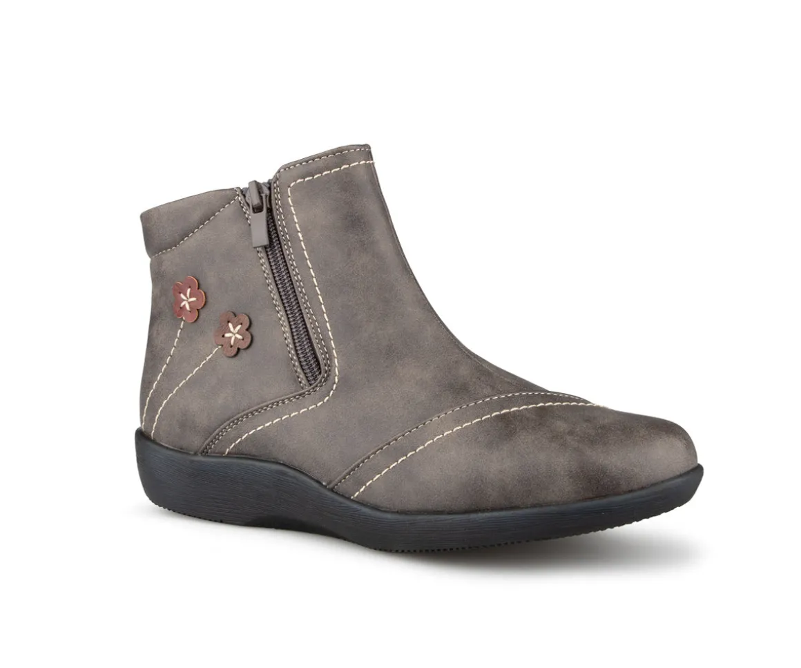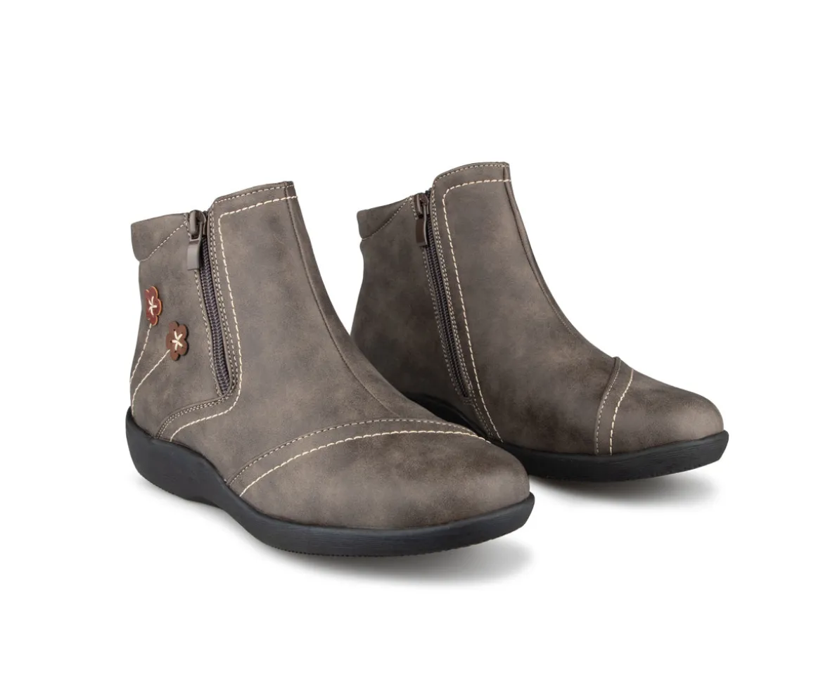 Ces bottillons courts Ultime Confort pour femmes sont conçus pour allier élégance et confort. Munis d’une fermeture éclair YKK pour un enfilage facile, ils sont dotés d’une empeigne en cuir synthétique avec une jolie décoration florale assortie, ajoutant une touche de style unique. La doublure en imitation fourrure ultra douce assure chaleur et confort. Leur semelle intérieure amovible offre un soutien personnalisé, tandis que la semelle extérieure en TPR garantit une durabilité et une adhérence maximales.