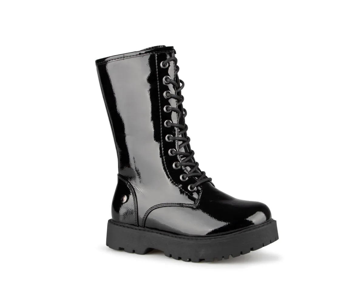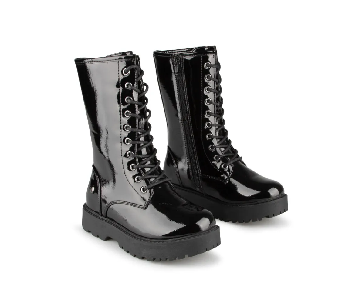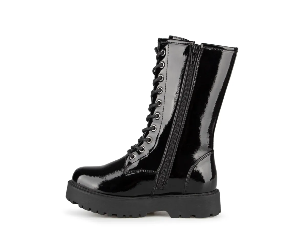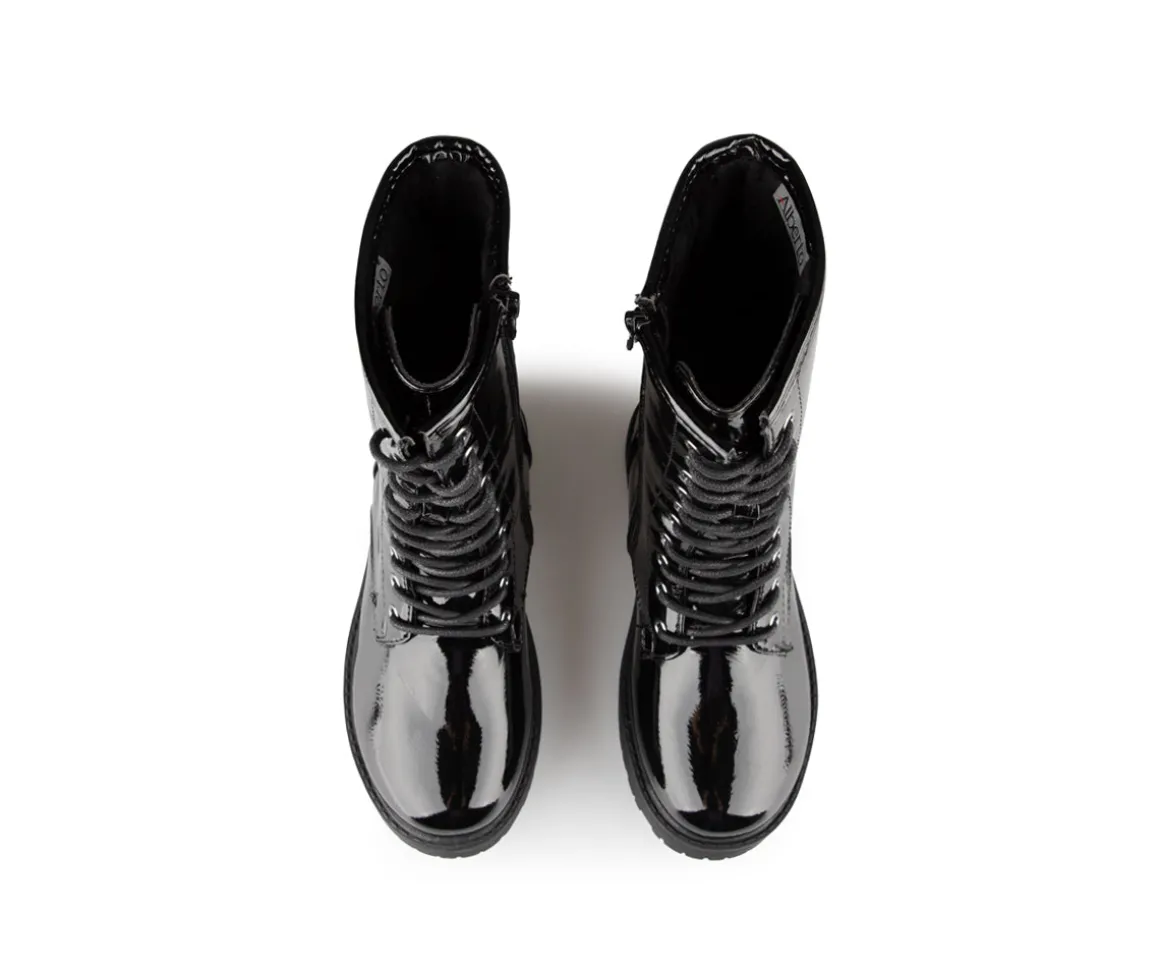Bottillons mi-mollets Alberto pour filles avec empeigne en cuir synthétique verni et doublure en imitation de fourrure douce. La semelle intérieure est en feutre noir et la semelle extérieure est en TPR, offrant confort et durabilité. Ces bottillons élégants et pratiques sont parfaits pour garder les pieds de votre enfant au chaud et au sec pendant les mois froids.