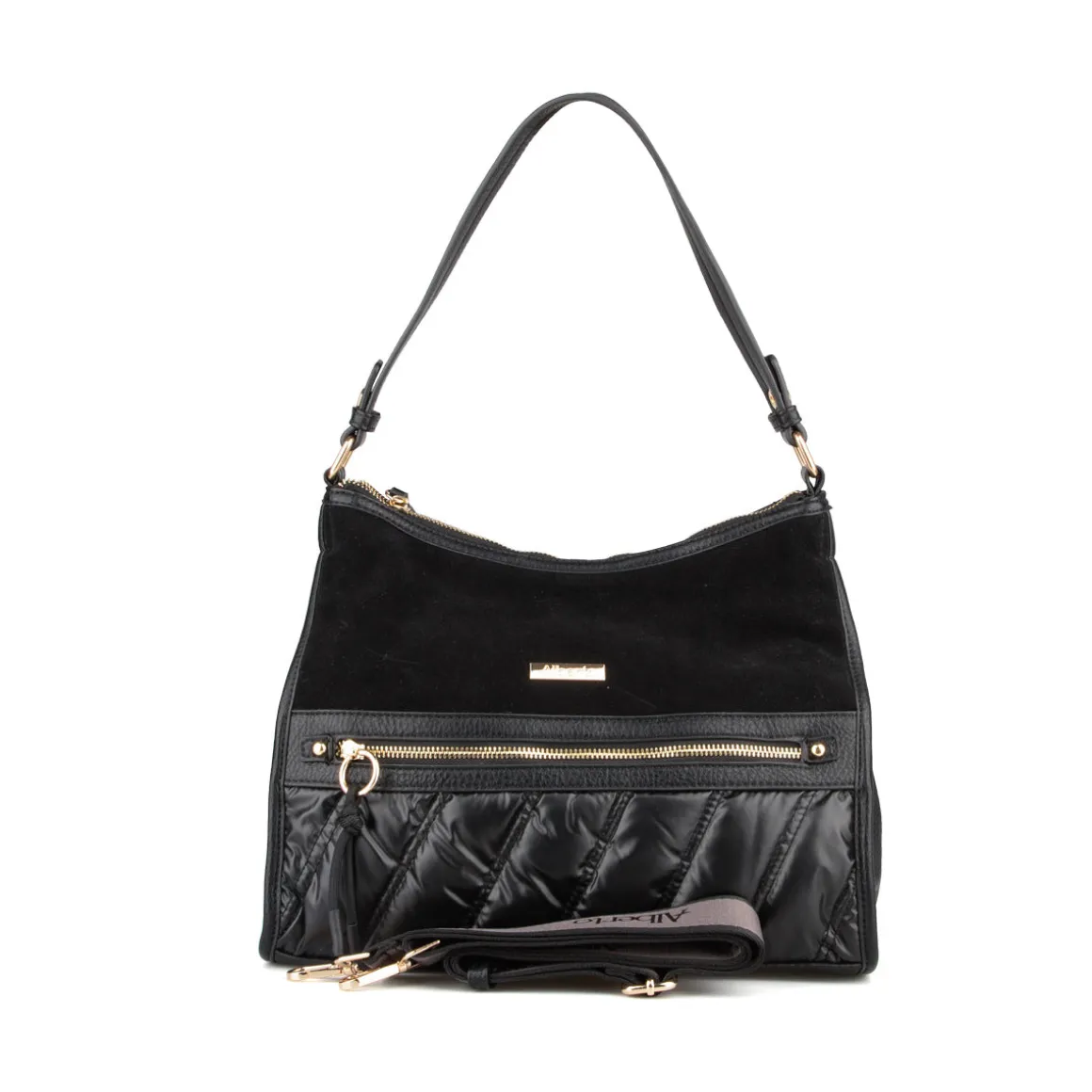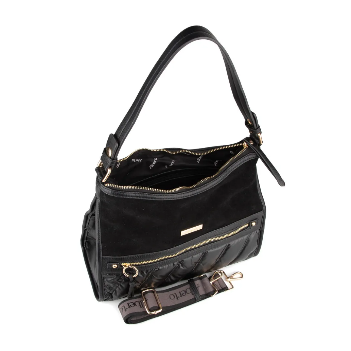 Le sac à main Alberto pour femmes combine cuir synthétique, suède et nylon pour un look élégant et polyvalent. Son intérieur en tissu imprimé et ses multiples options de port grâce à la bandoulière et la poignée ajustables offrent confort et praticité au quotidien.