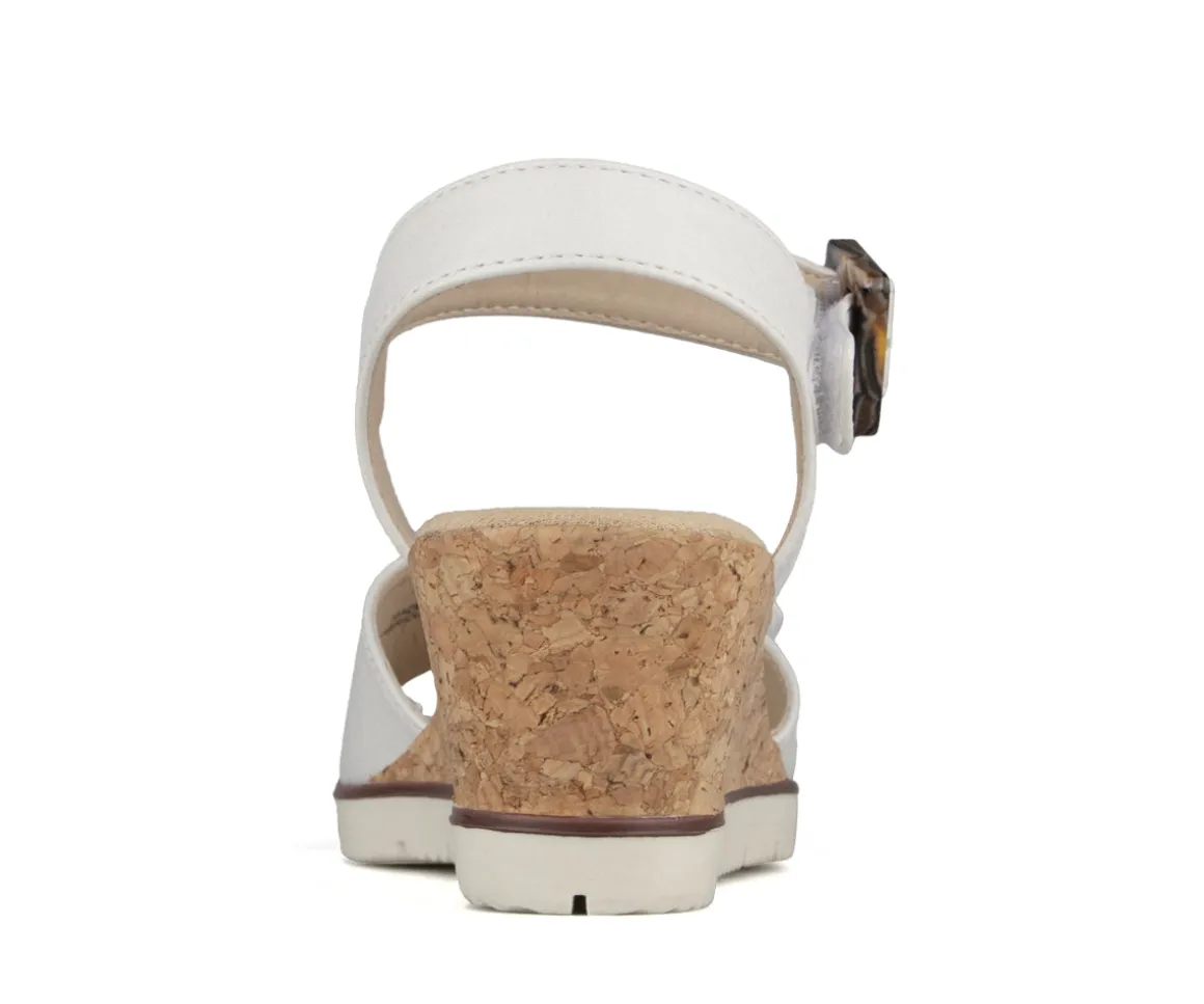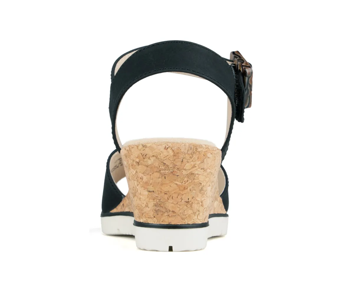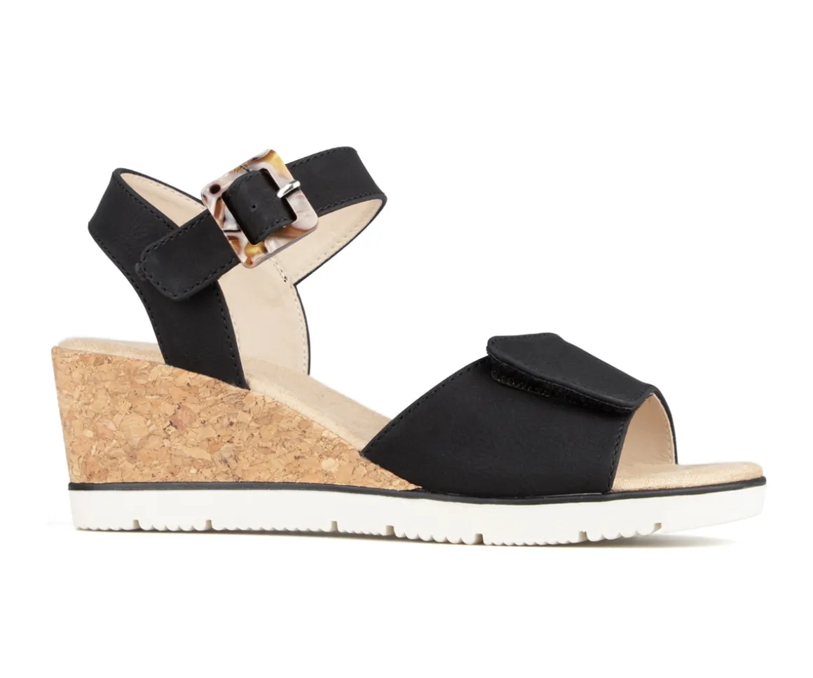 Sandales à talon compensé Alberto pour femmes, fabriquées en cuir synthétique nubuck pour un style élégant et estival. La doublure en PU et la semelle intérieure en microfibre offrent un confort agréable tout au long de la journée. La semelle extérieure en TPR avec liège assure une bonne stabilité, tandis que les deux velcros permettent un ajustement facile et sécuritaire.