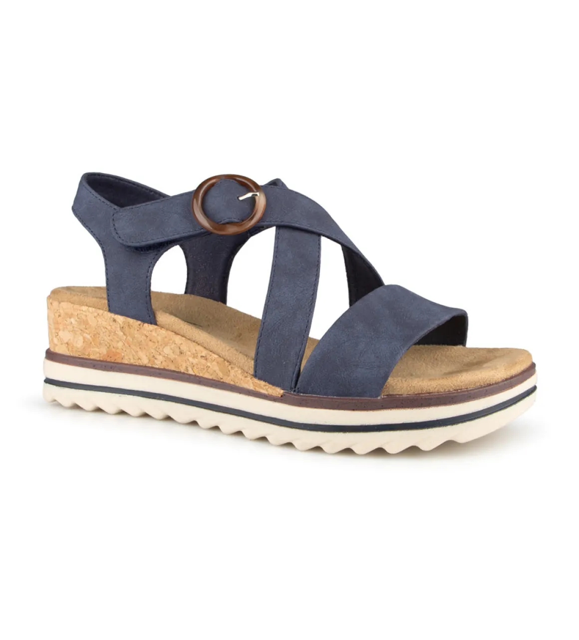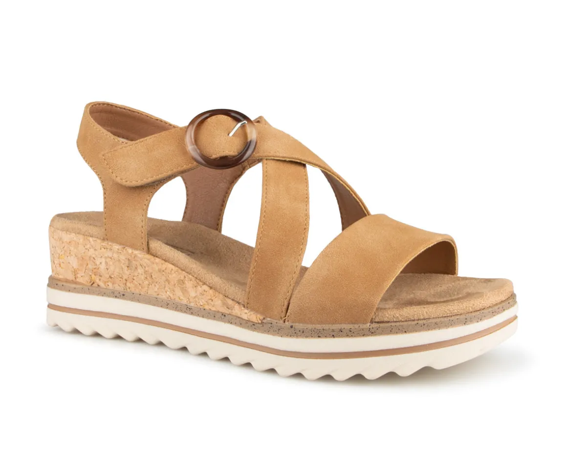 Sandale à talon compensé Akebie d’Ultime confort pour femme avec des courroies croisées sur l’empeigne et un velcro à la cheville. Cette sandale confortable est le choix parfait pour vous, vous permettant de rester à l’aise tout en étant élégante.