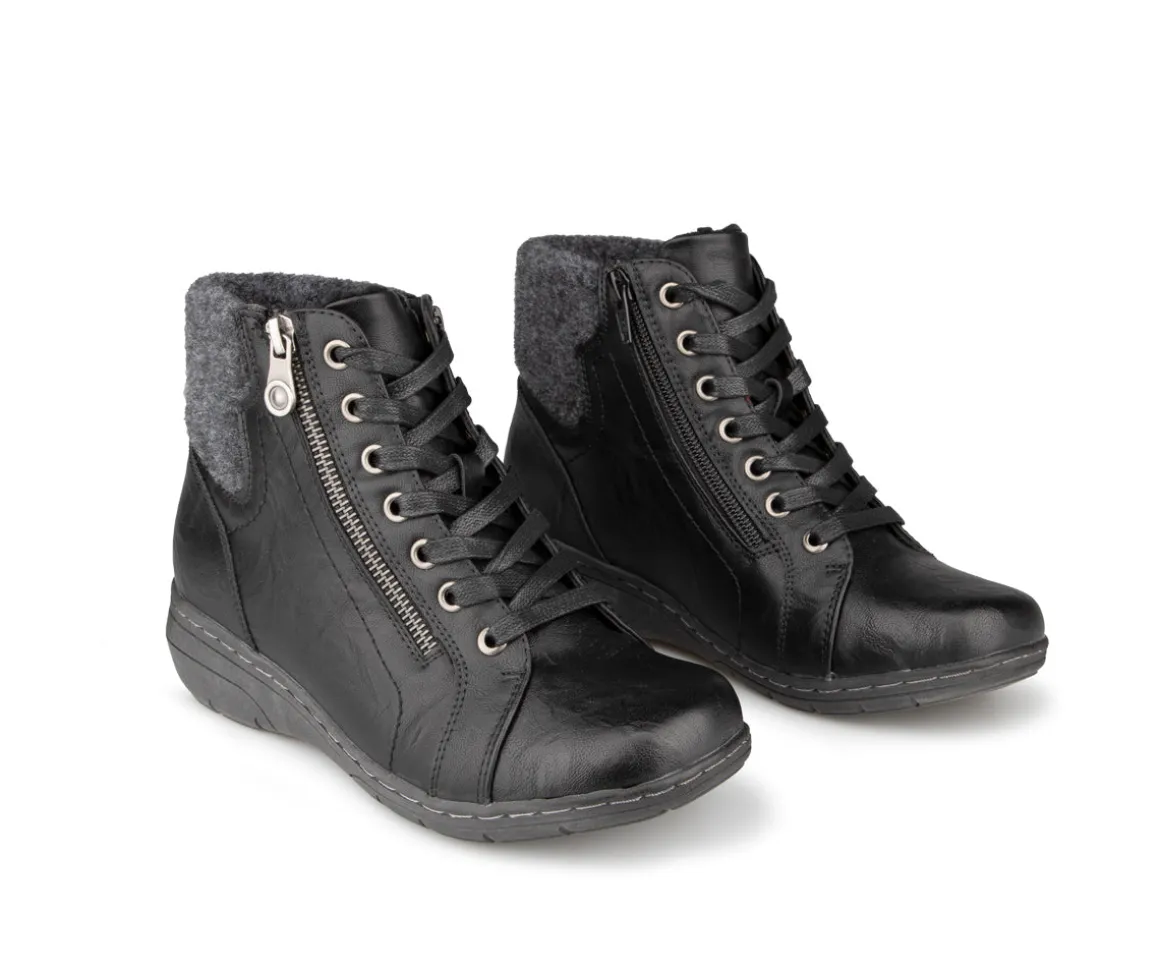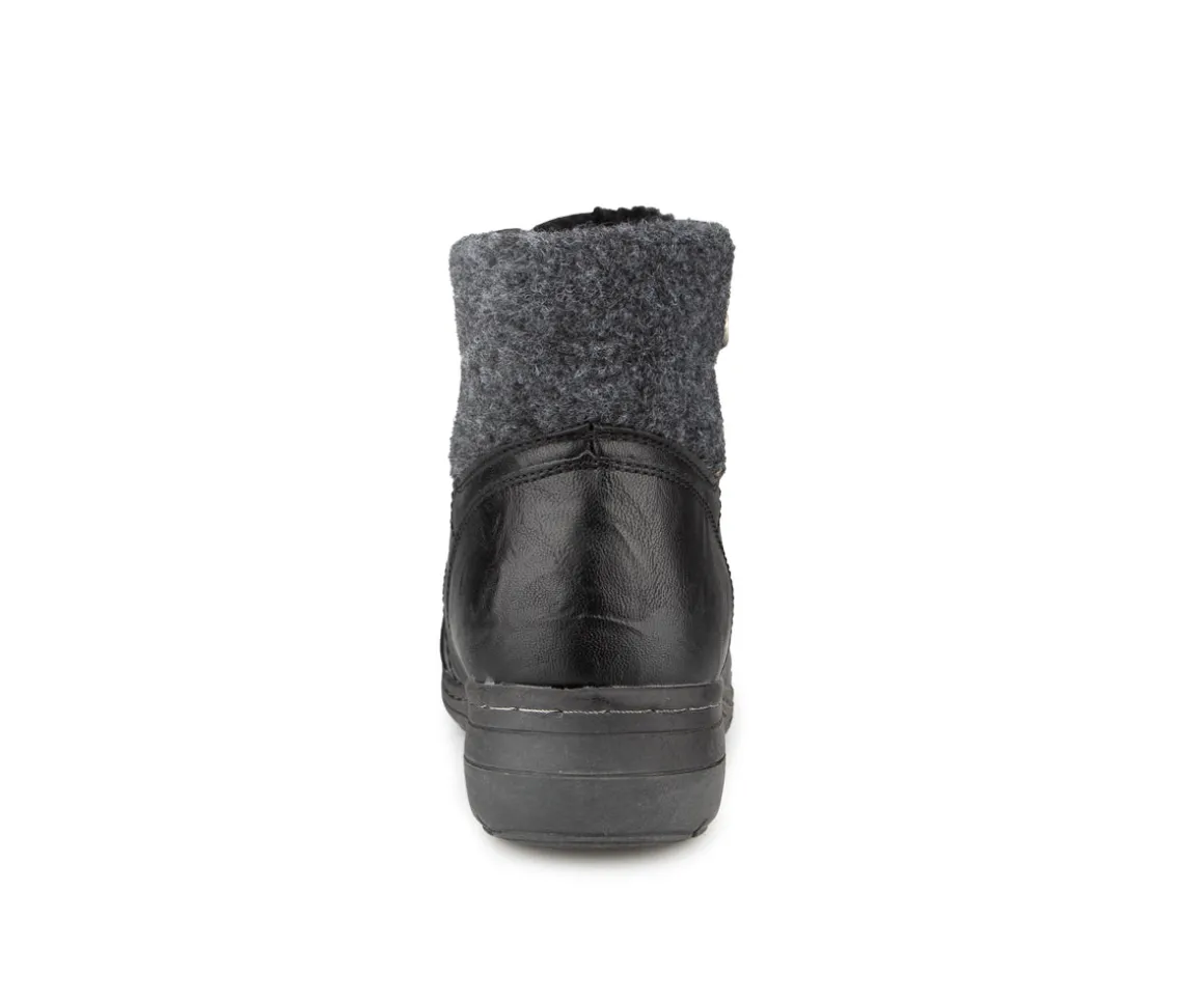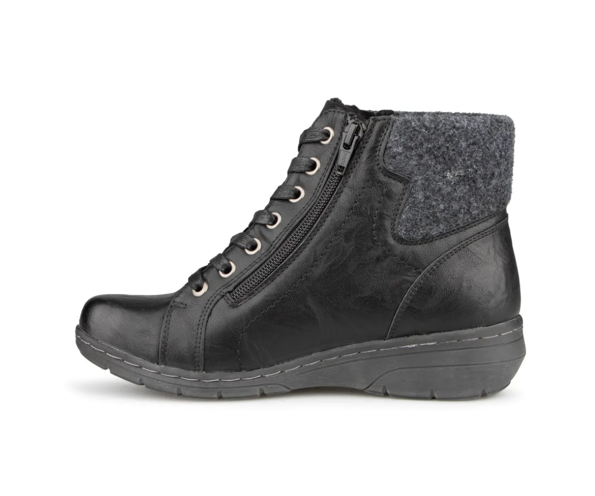 Ces bottillons courts Ultime Confort pour femmes allient praticité et style. Ils sont équipés de lacets et d’une fermeture éclair intérieure pour un enfilage facile. L’empeigne est faite de cuir synthétique et de feutre, avec un talon compensé pour une touche d’élégance. La doublure en imitation fourrure et la semelle intérieure amovible en feutre offrent un confort optimal, tandis que la semelle extérieure en TPR garantit une bonne durabilité.