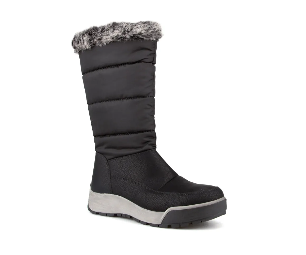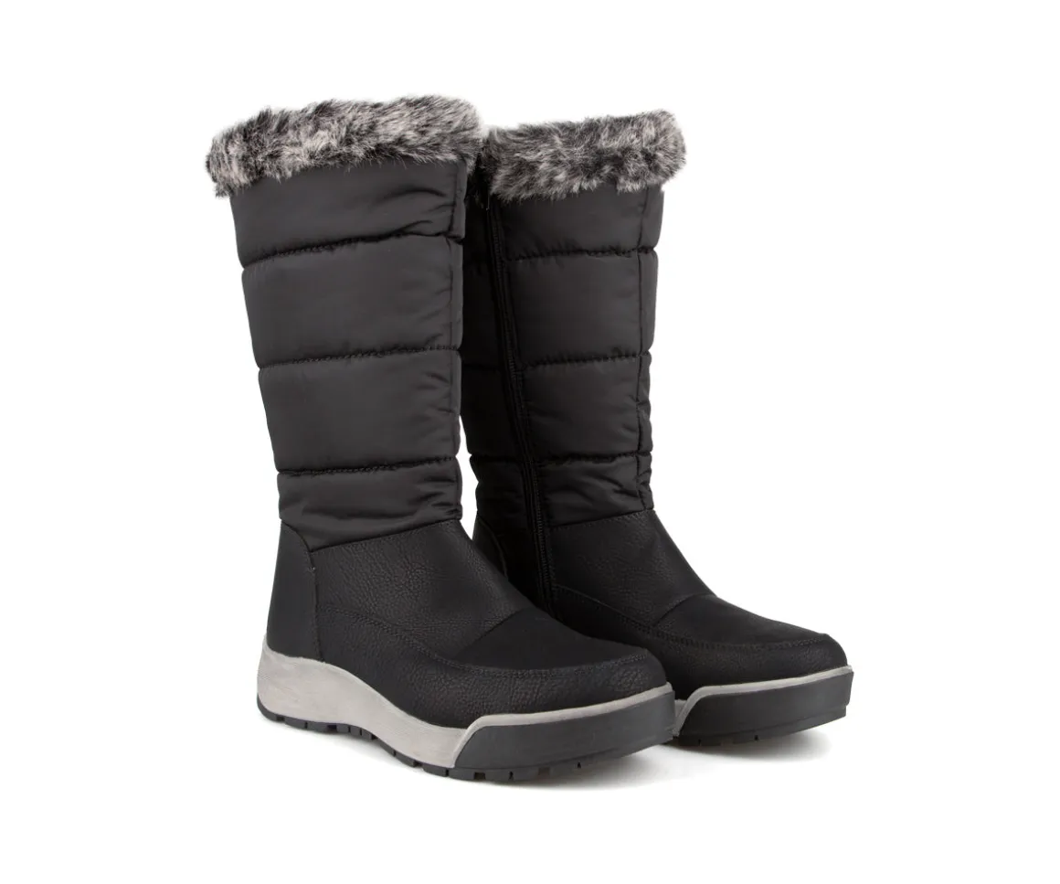 Ces bottes d’hiver hautes West Way pour femmes offrent chaleur, confort et protection contre l’humidité. Imperméables grâce à la membrane Aquatex, elles sont fabriquées en cuir synthétique et nylon avec un collet en fourrure. La doublure en laine synthétique et la semelle intérieure amovible en feutre assurent confort et isolation, tandis que la semelle extérieure en TPR antidérapante garantit stabilité sur les surfaces glissantes. Hauteur du talon : 1,5 pouces.