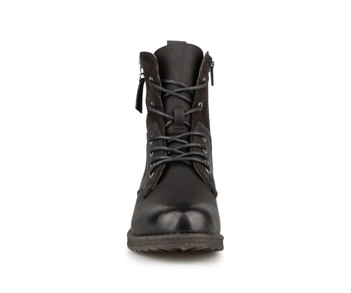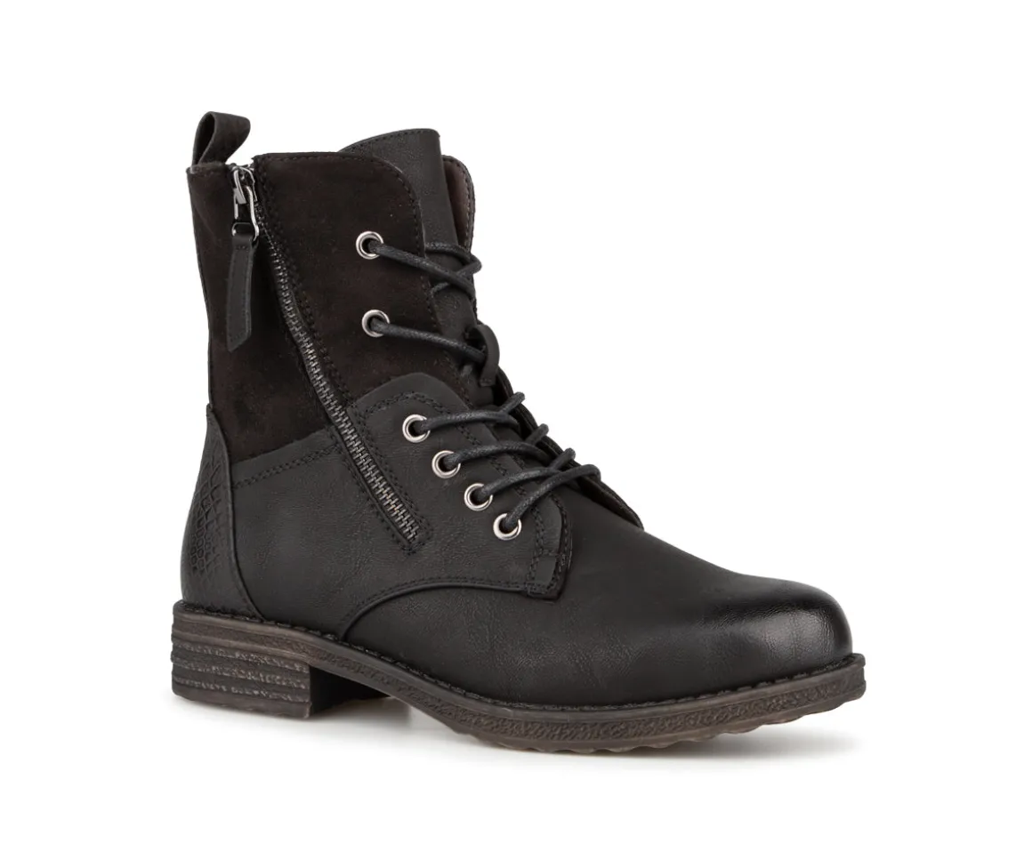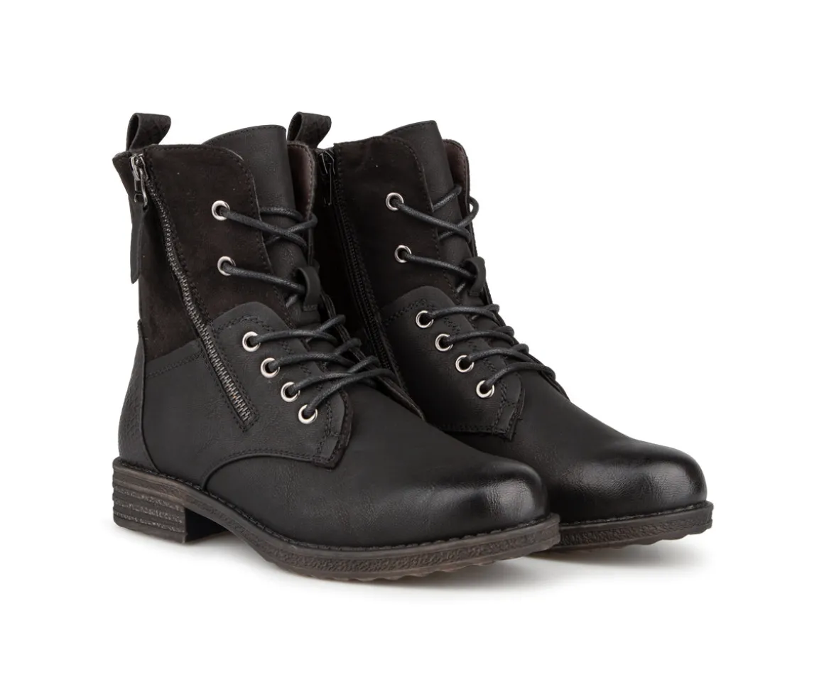 Ces bottillons pour femmes combinent confort et style avec une doublure douce en imitation fourrure. Fabriqués en PU et microfibre, ils sont faciles à enfiler grâce à leur laçage et fermeture éclair YKK. Semelle intérieure en feutre amovible et talon plat de 1,25 po pour un confort optimal au quotidien.