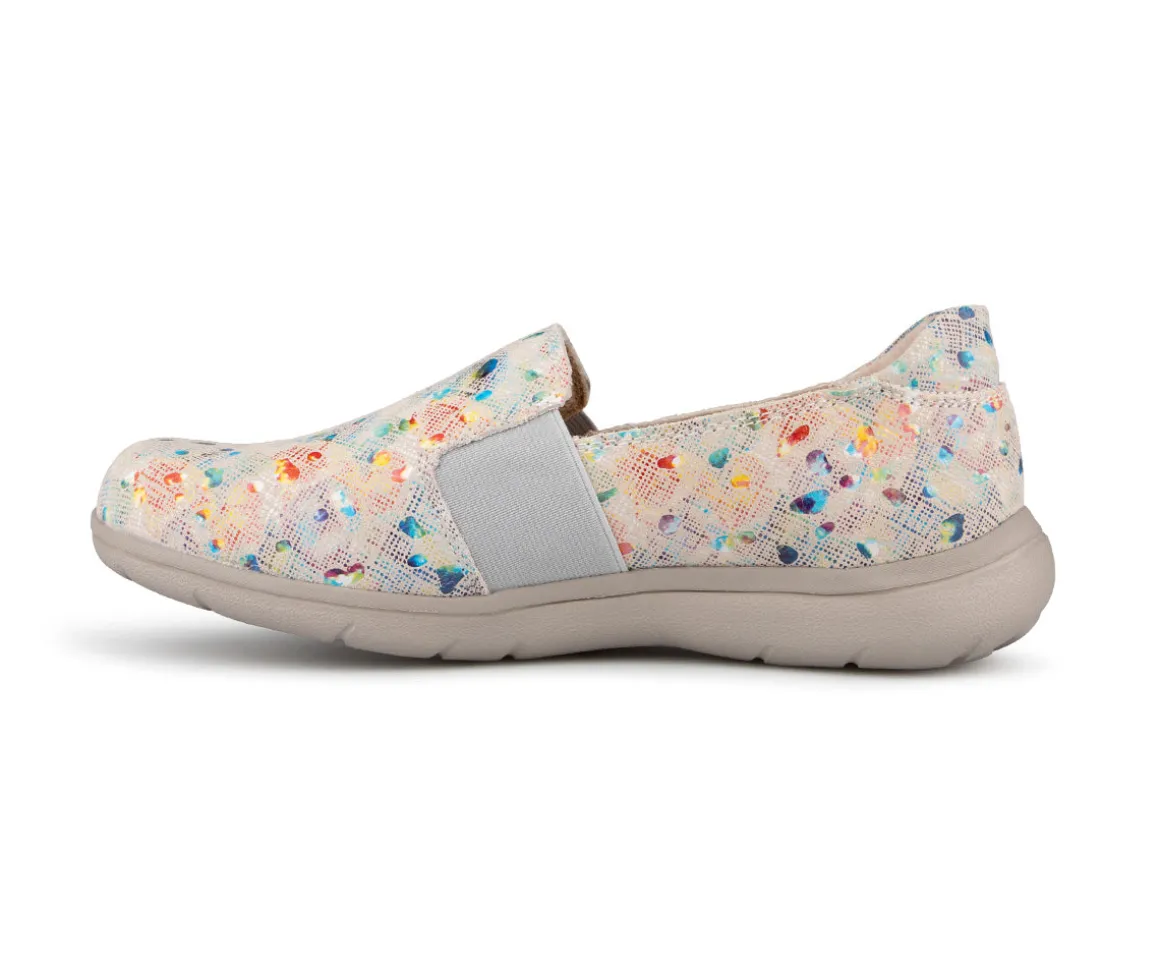 Chaussures Ultime Confort de type flâneur pour femmes avec une empeigne multicolore et un élastique de chaque côté.
