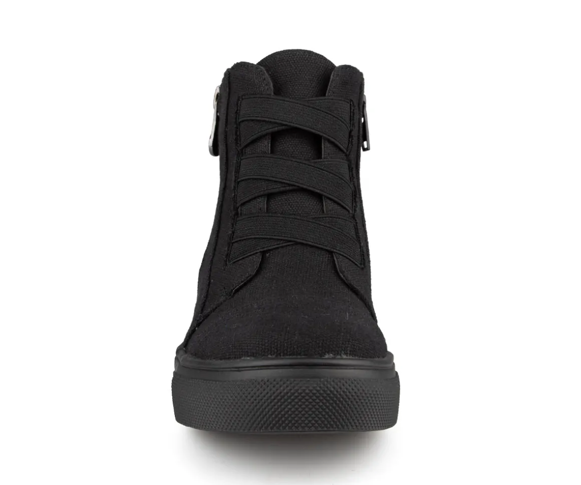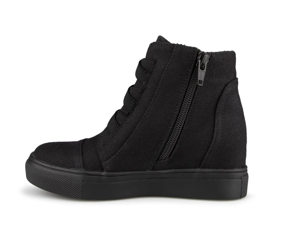 Chaussures en toile à talon compensé caché avec élastique et fermeture éclair. Disponible dans deux couleurs (noir et multicolore).