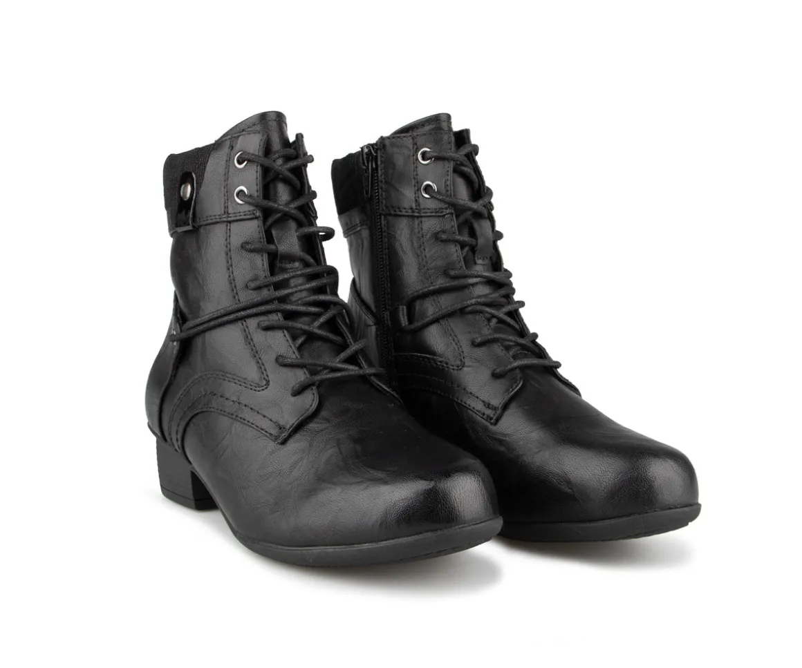 Ces bottillons courts Ultime Confort pour femmes combinent style et praticité. Ils sont munis de lacets ainsi que d’une fermeture éclair intérieure YKK pour un enfilage facile. Conçus en cuir synthétique, ces bottillons sont dotés d’un talon carré pour plus de stabilité et d’une petite doublure en imitation de fourrure courte pour un confort supplémentaire. La semelle extérieure en TPR assure une durabilité accrue et une bonne adhérence.