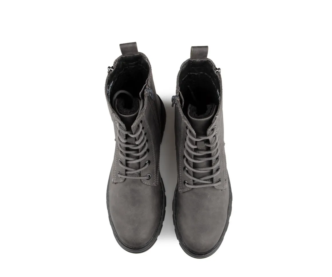 Ces bottes courtes Alberto pour femmes sont lacées et dotées d’une fermeture éclair intérieure pour un enfilage facile. Elles possèdent un talon plat de 1.5 po et une doublure en feutre noir pour plus de confort. Leur semelle extérieure en TPR assure une bonne adhérence, tandis que l’empeigne en cuir synthétique ajoute une touche élégante. Disponibles en largeur B.
