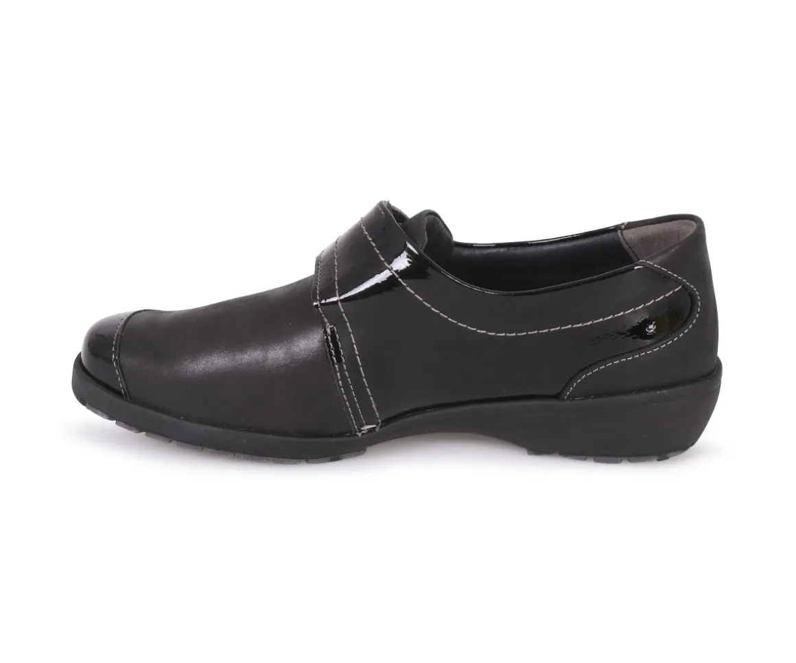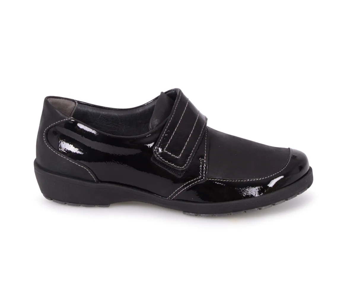 Ces souliers en cuir vernis Suave pour femmes, avec un velcro sur l’empeigne, assurent un enfilage facile tout en offrant un confort optimal grâce à leur talon compensé. Parfaits pour une utilisation quotidienne, ils allient élégance et praticité.