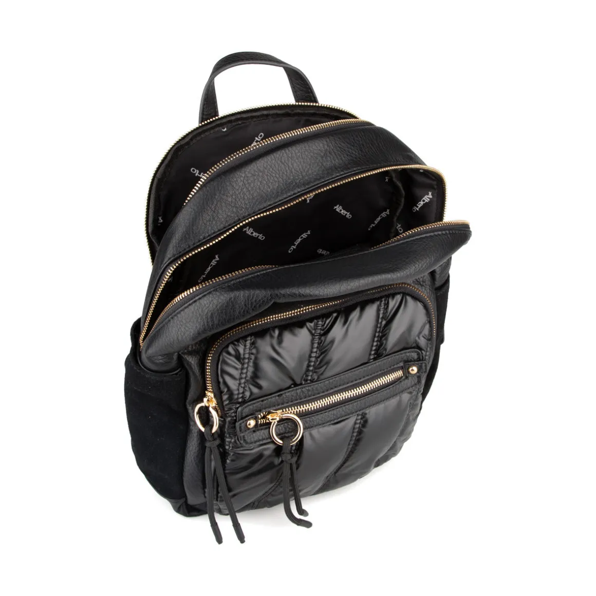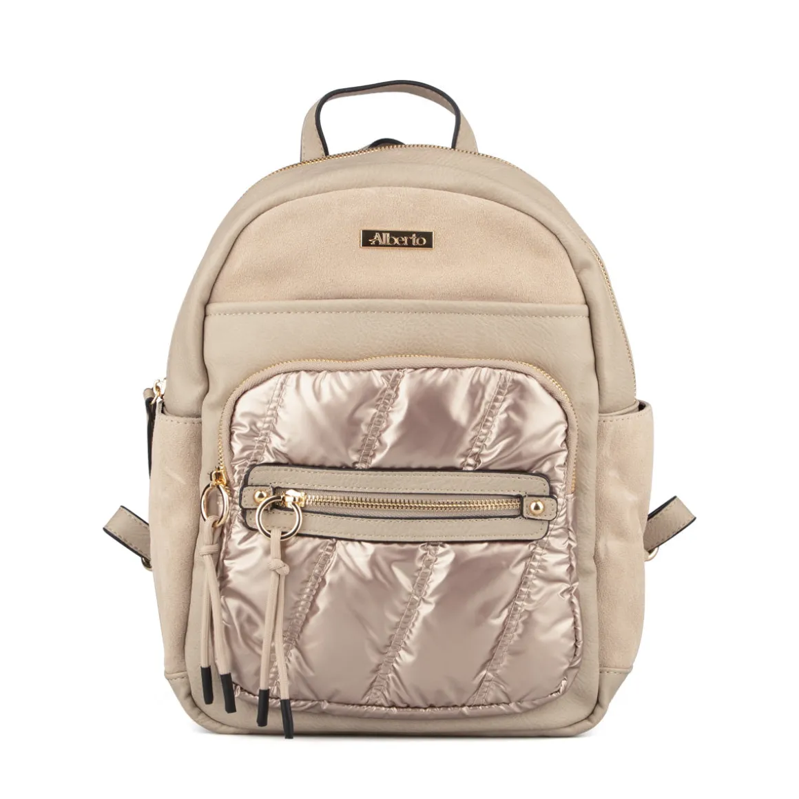 Le sac à dos Alberto pour femmes combine cuir synthétique, daim et nylon pour un style élégant et fonctionnel. Son intérieur en tissu et ses bandoulières et poignée ajustables et amovibles permettent un transport confortable. Grand compartiment principal et pochettes pratiques pour organiser tous vos essentiels.