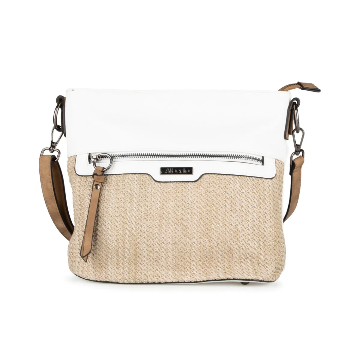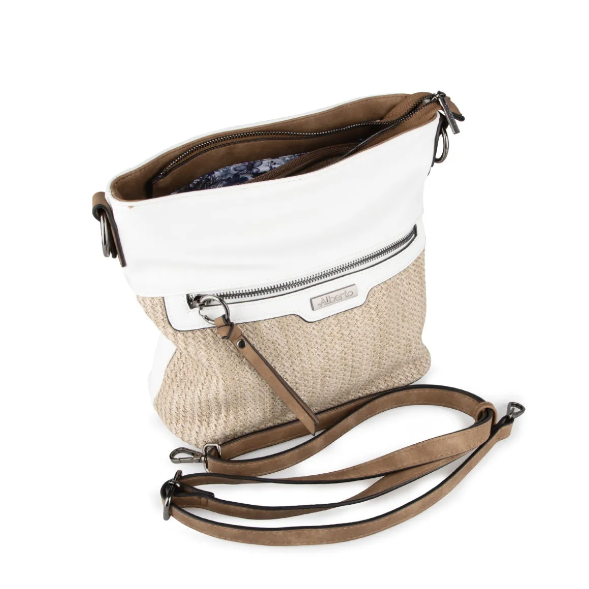 Avec son mélange raffiné de cuir synthétique et de paille beige, ce sac à main Alberto ajoute une touche de fraîcheur à votre tenue. Il est doté d’un grand compartiment avec fermeture éclair pour garder vos essentiels bien organisés. Sa bandoulière amovible et réglable vous permet de le porter à l’épaule ou à la main, selon votre style du moment.