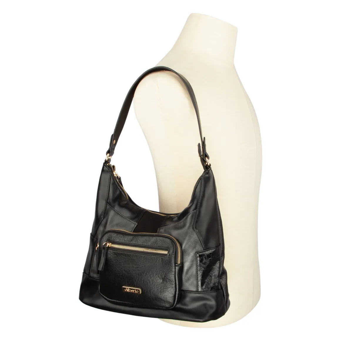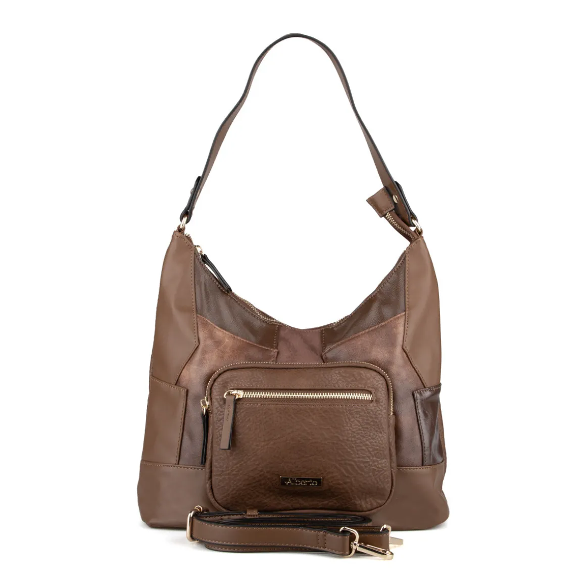 Ce sac à main Alberto pour femmes, de style Hobo, est fabriqué en cuir synthétique avec un intérieur en tissu imprimé. Son format pratique, accompagné d’une bandoulière et d’une poignée ajustables et amovibles, en fait un choix idéal pour le quotidien.