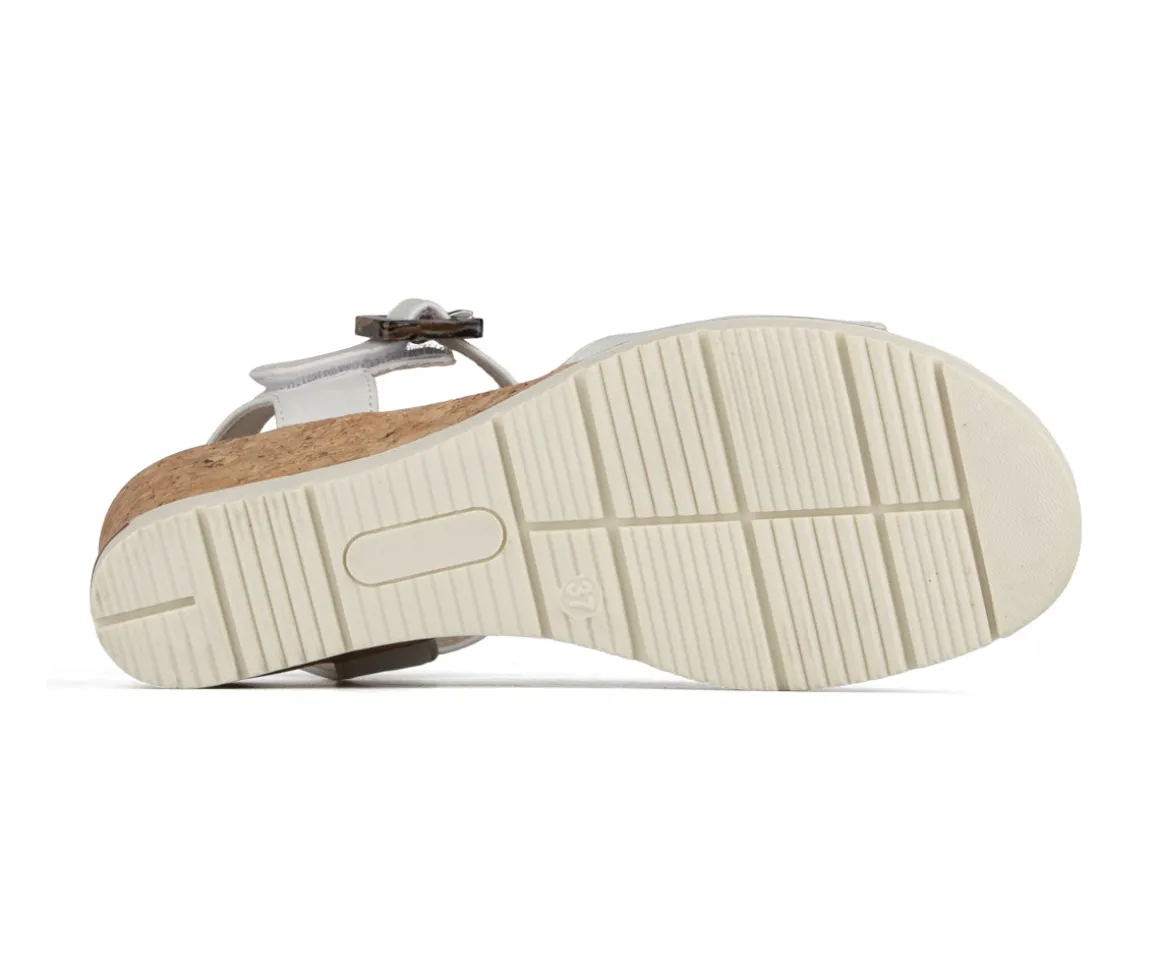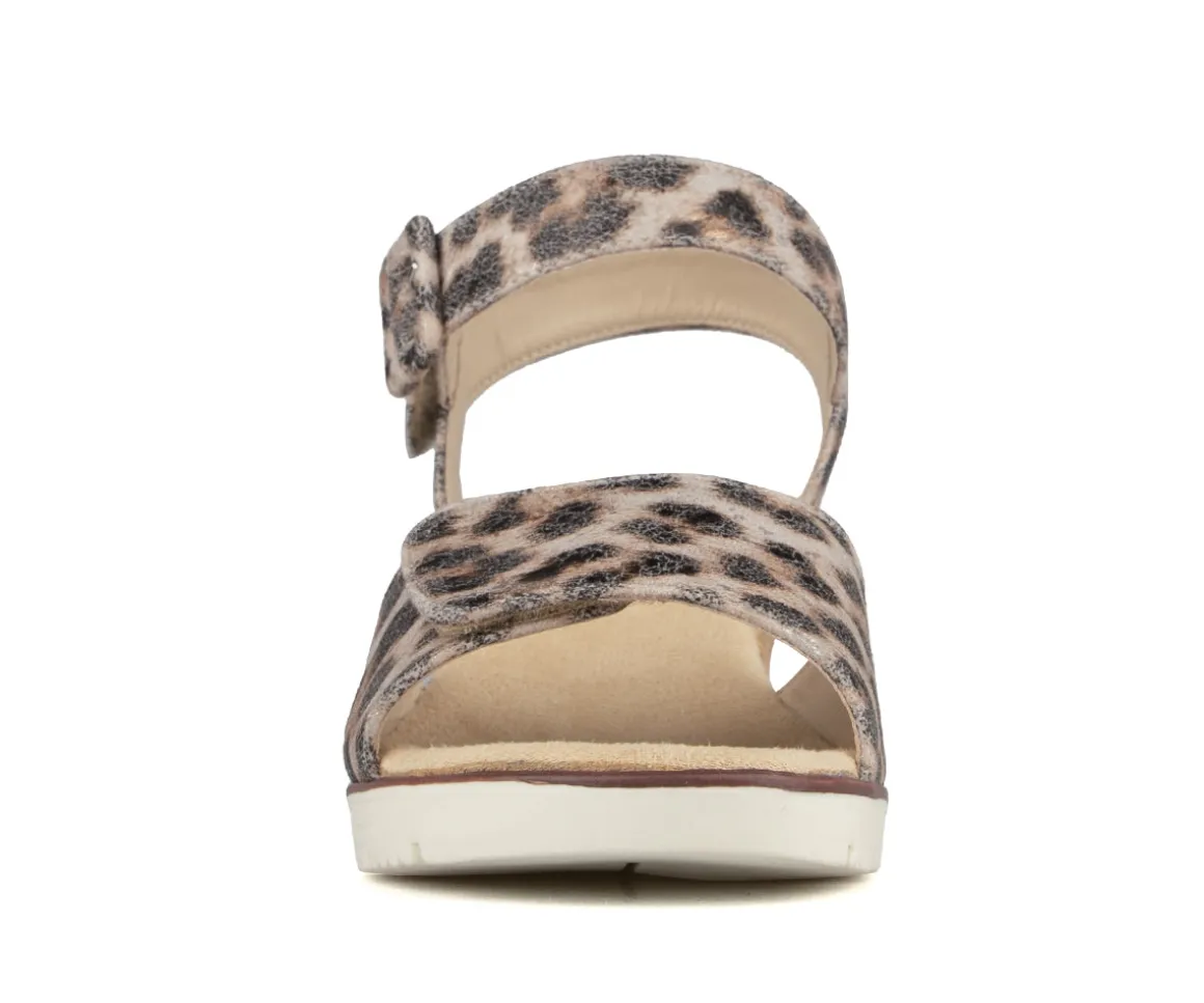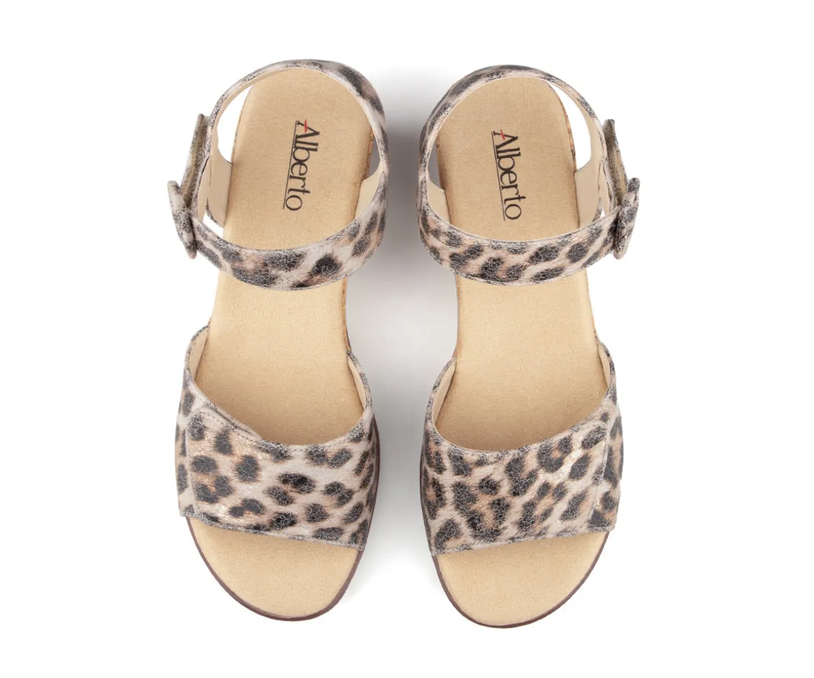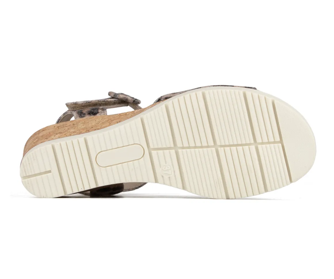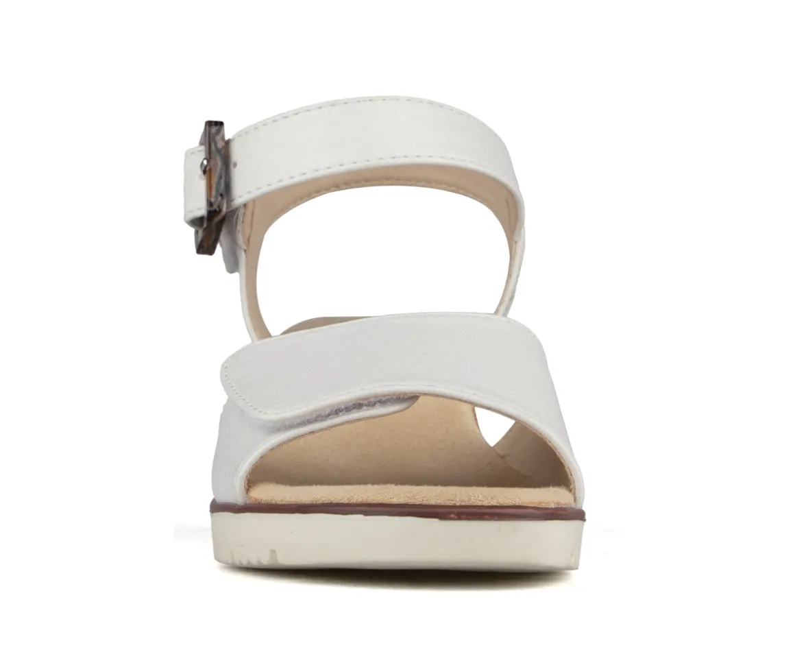 Sandales à talon compensé Alberto pour femmes, fabriquées en cuir synthétique nubuck pour un style élégant et estival. La doublure en PU et la semelle intérieure en microfibre offrent un confort agréable tout au long de la journée. La semelle extérieure en TPR avec liège assure une bonne stabilité, tandis que les deux velcros permettent un ajustement facile et sécuritaire.