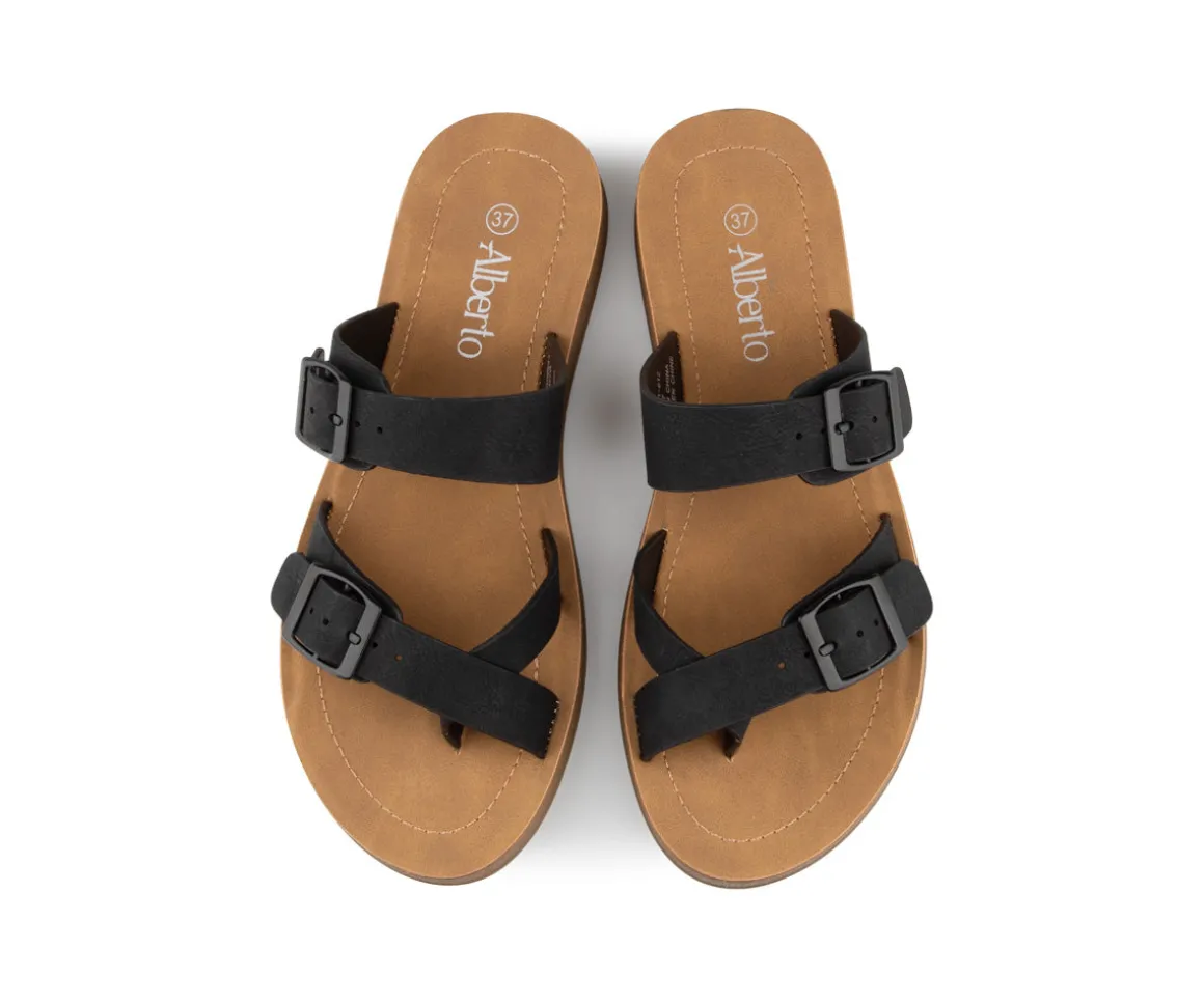 Parfaites pour les journées ensoleillées, ces sandales mule Alberto pour femme combinent style et confort. Conçues en cuir synthétique, elles présentent un sangle d’orteil qui ajoute une touche distinctive à votre look. Leur semelle en PU avec bon amorti assure un confort optimal tout au long de la journée, tandis que leur talon plat permet une démarche naturelle et détendue.