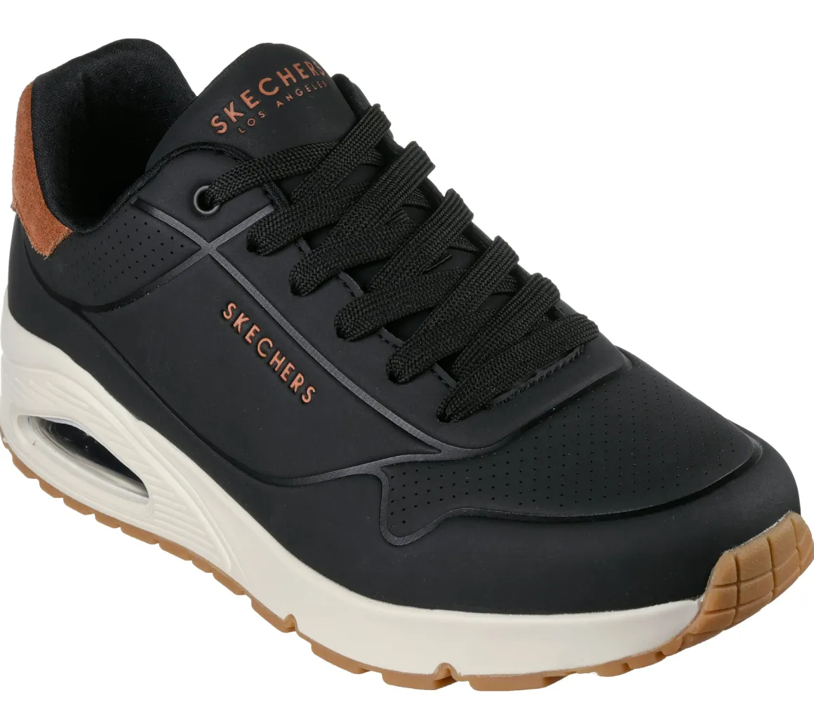 Ce soulier Skechers pour hommes allie look sportif et technologie de confort. Son empeigne en cuir durable avec garniture en suède offre un style raffiné, tandis que la semelle intercalaire Skech-Air® avec coussin d’air visible procure un excellent amorti. La semelle intérieure Skechers Air-Cooled Memory Foam® assure un confort respirant, et la semelle extérieure antidérapante flexible offre une bonne stabilité à chaque pas.