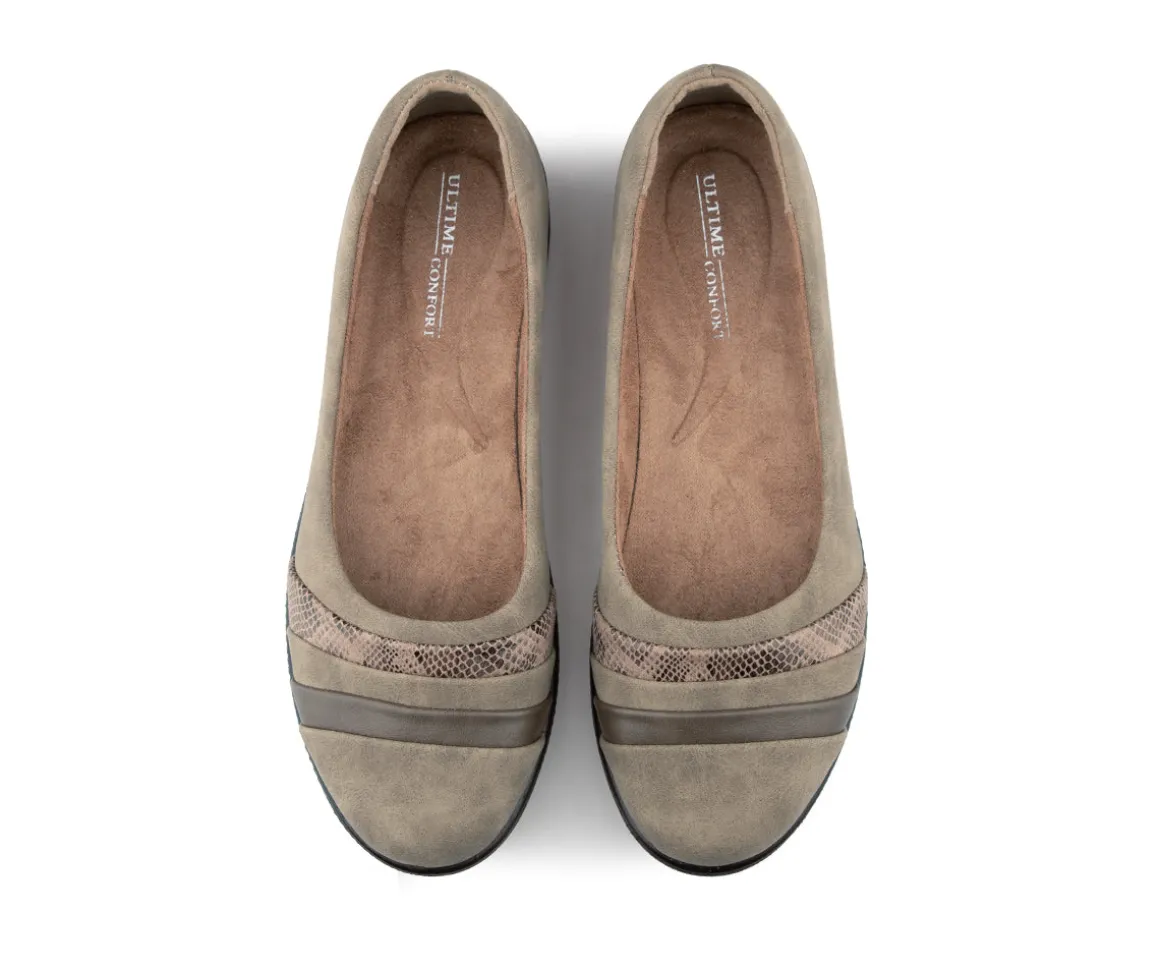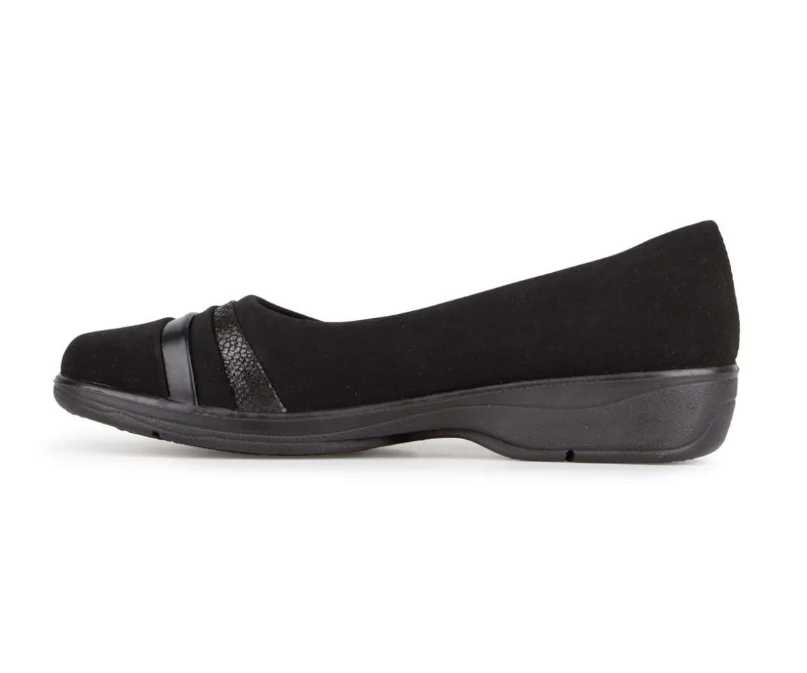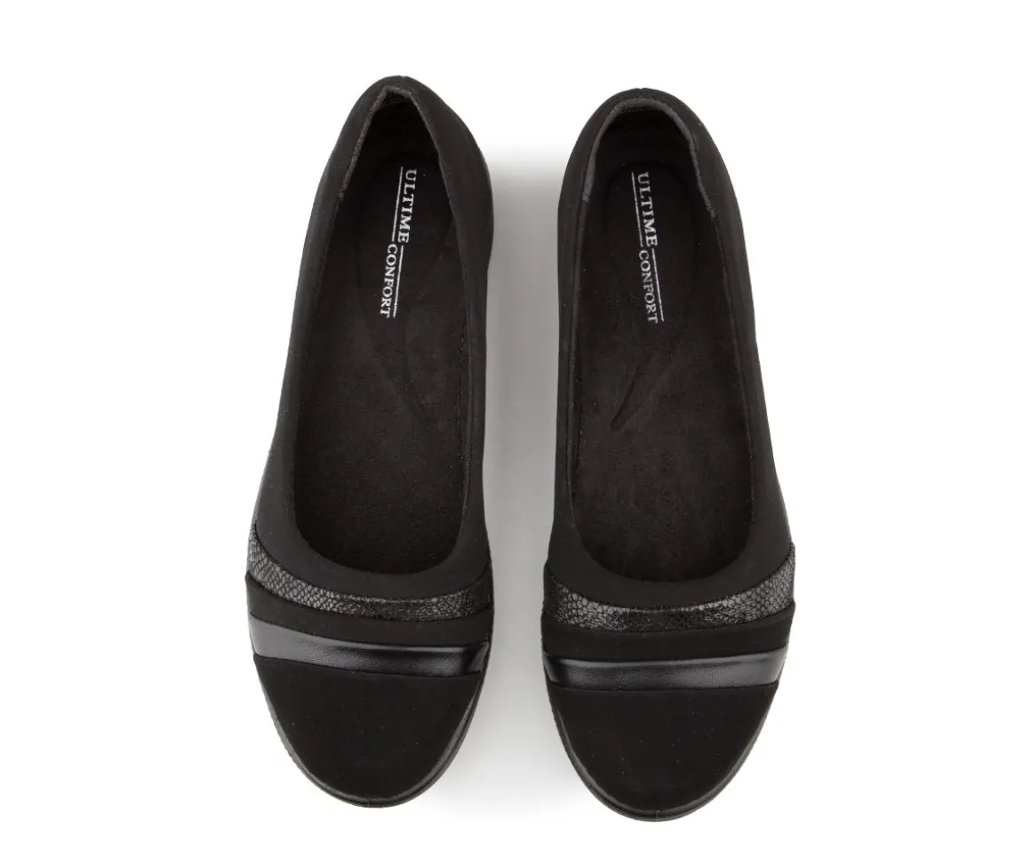 Cette ballerine Ultime Confort pour femmes combine le raffinement du nubuck PU à l’imprimé microfibre pour un style délicat et tendance. Sa doublure et sa semelle intérieure en microfibre offrent un confort respirant, tandis que la semelle amovible et extérieure en PU assurent un maintien flexible et durable.