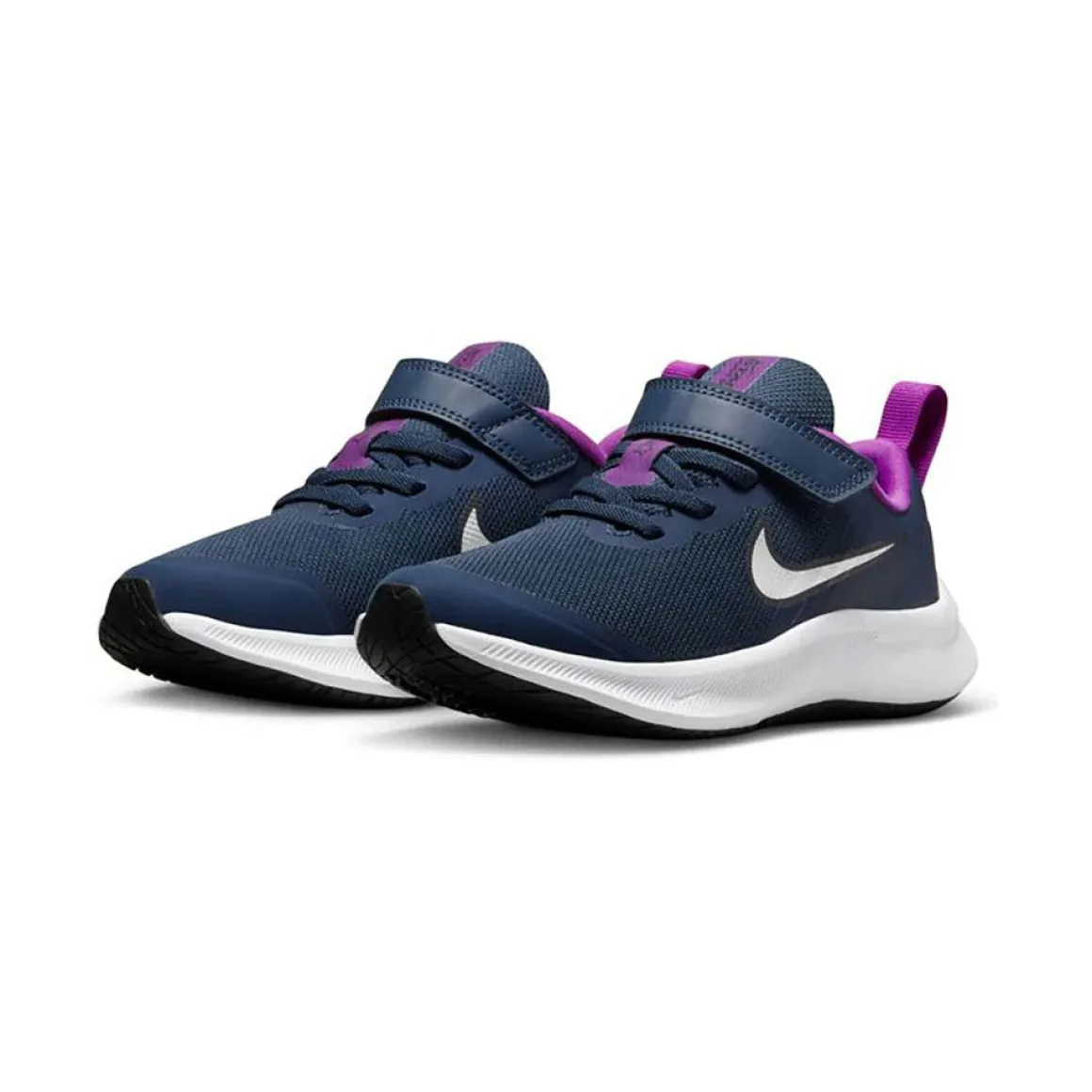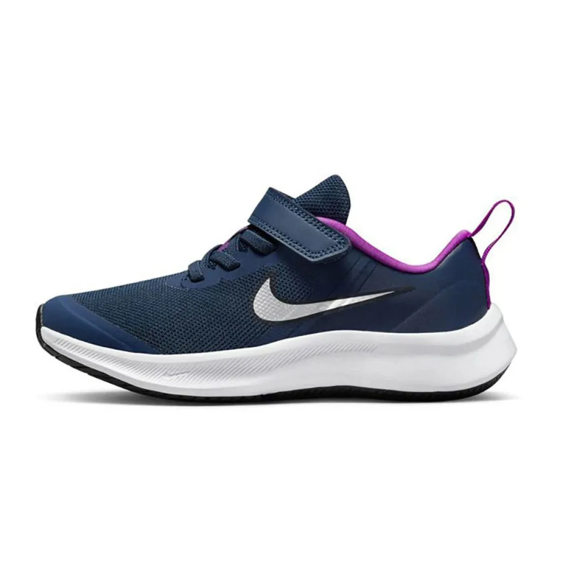 Chaussure Star Runner 3 Nike pour petite fille légère avec velcro et lacet élastique. Dessus en tissus maillé et cuir avec semelle extérieure en caoutchouc.