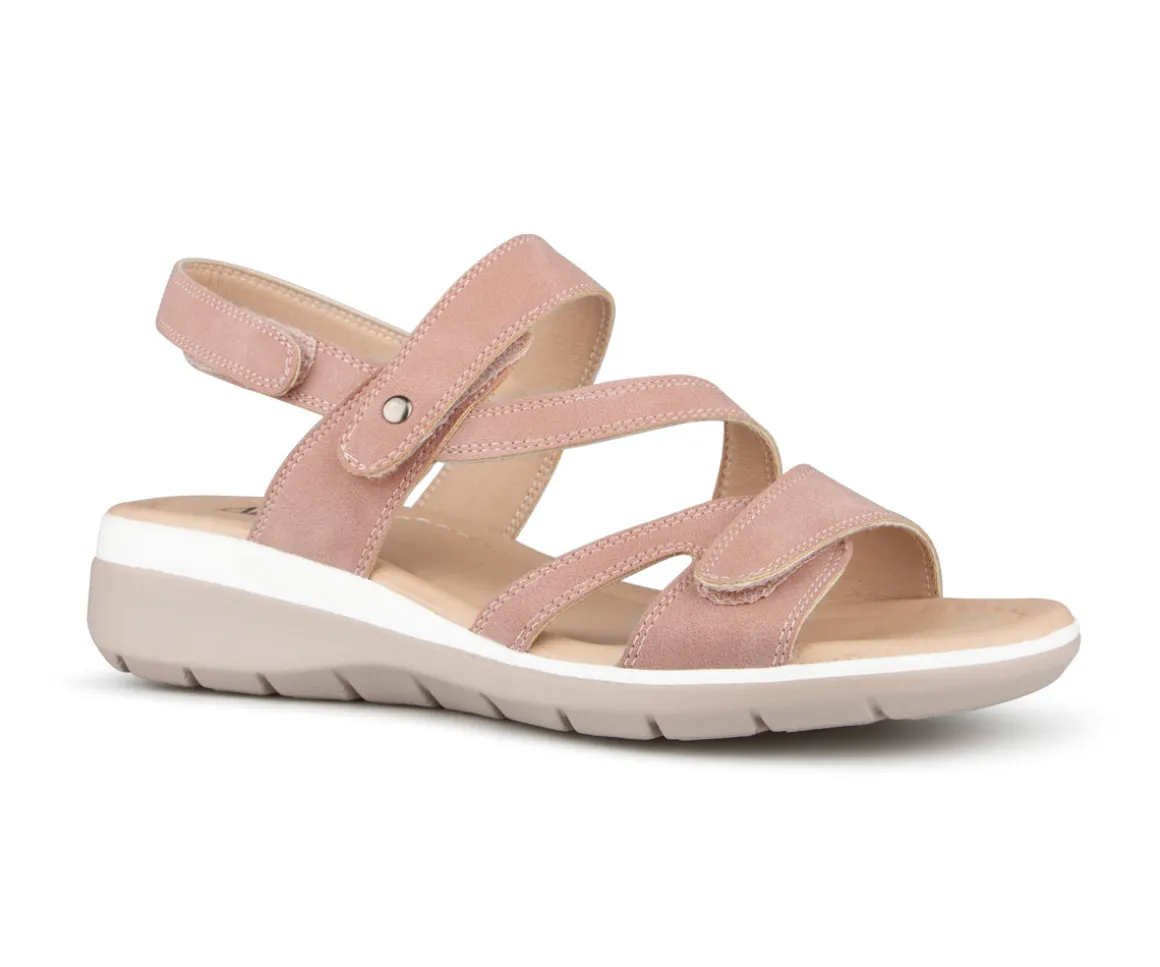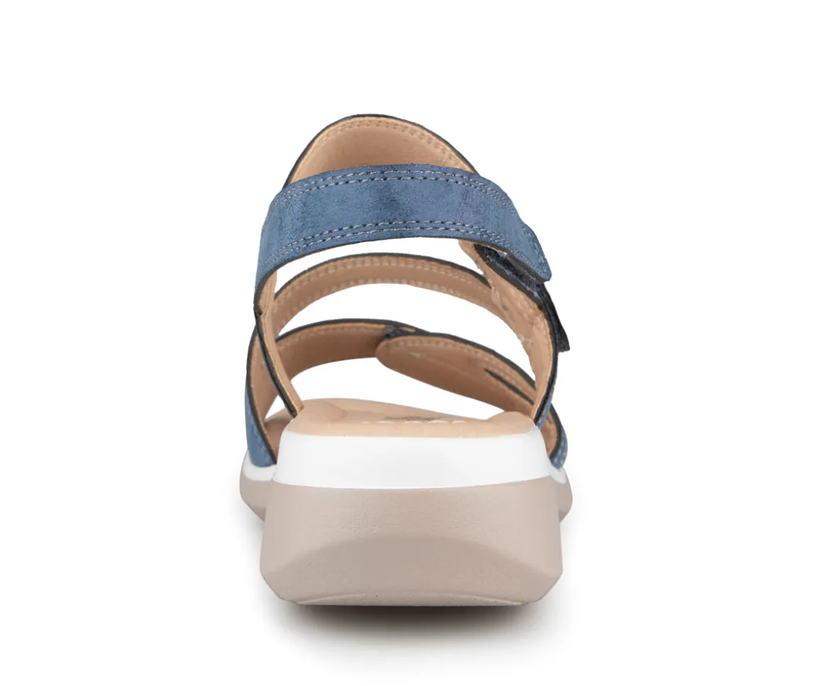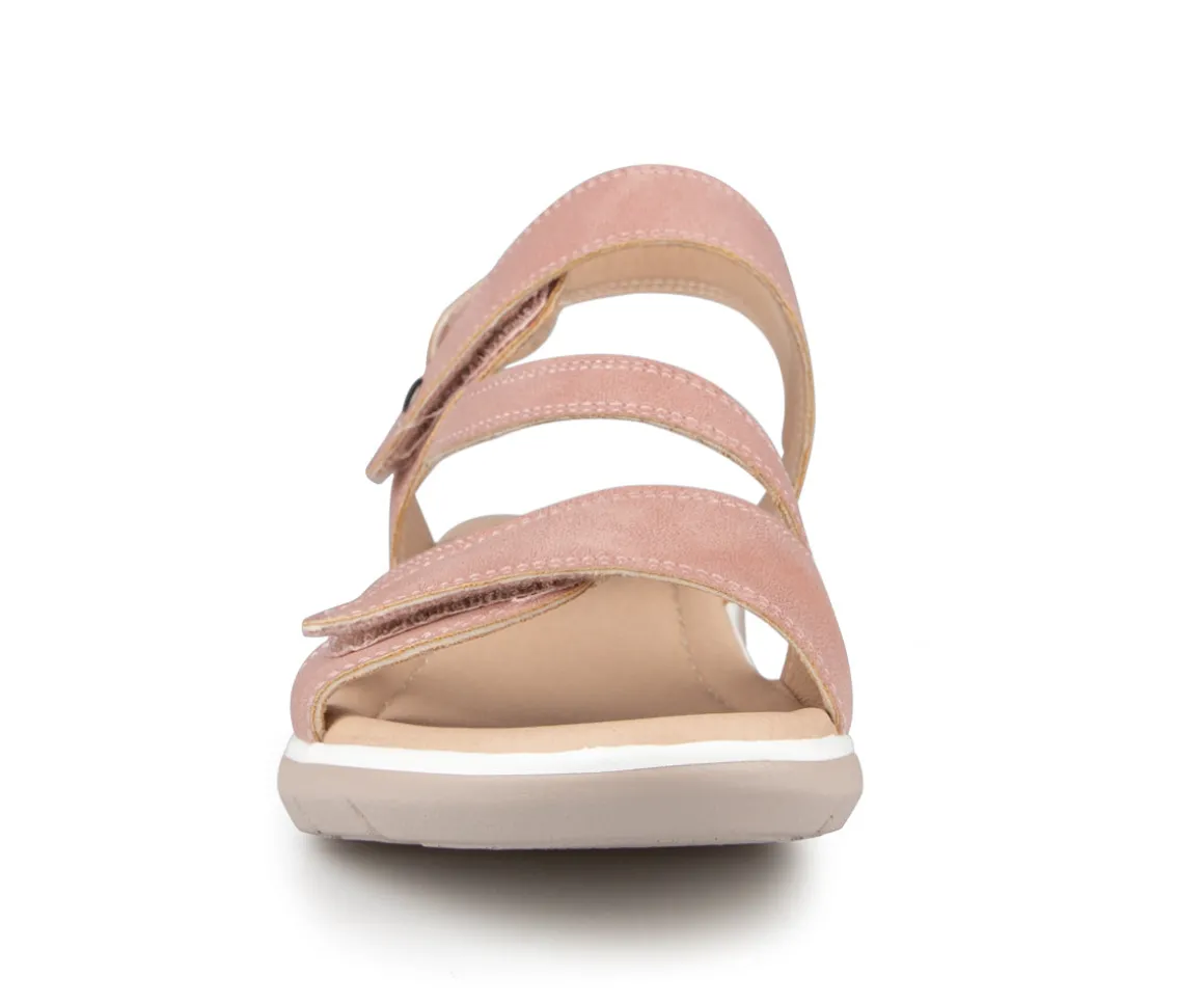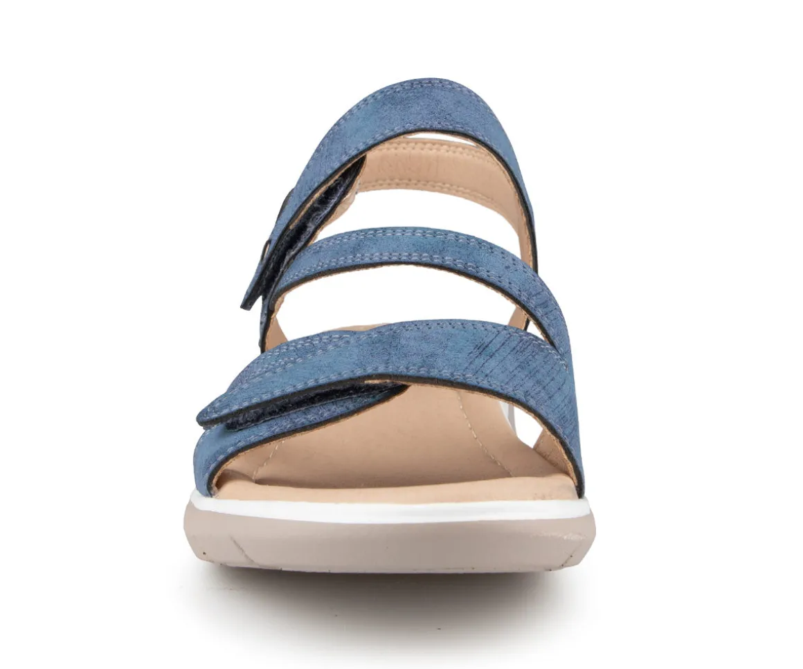 Sandale à talon Alberto pour femme avec talon compensé ainsi que 3 velcros sur l’empeigne. Disponible en 4 couleurs (Bleu, noir, rose et jaune).