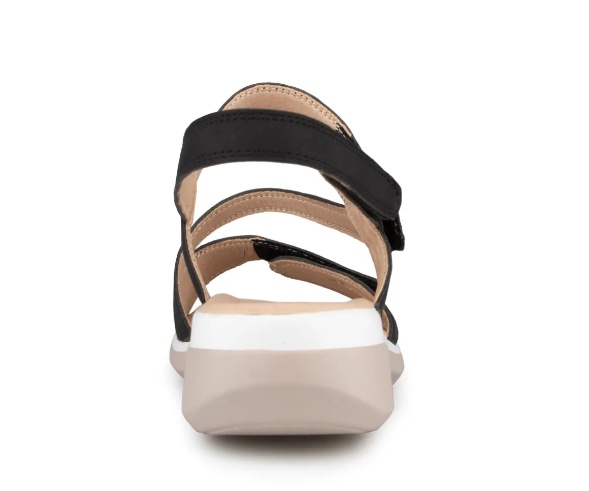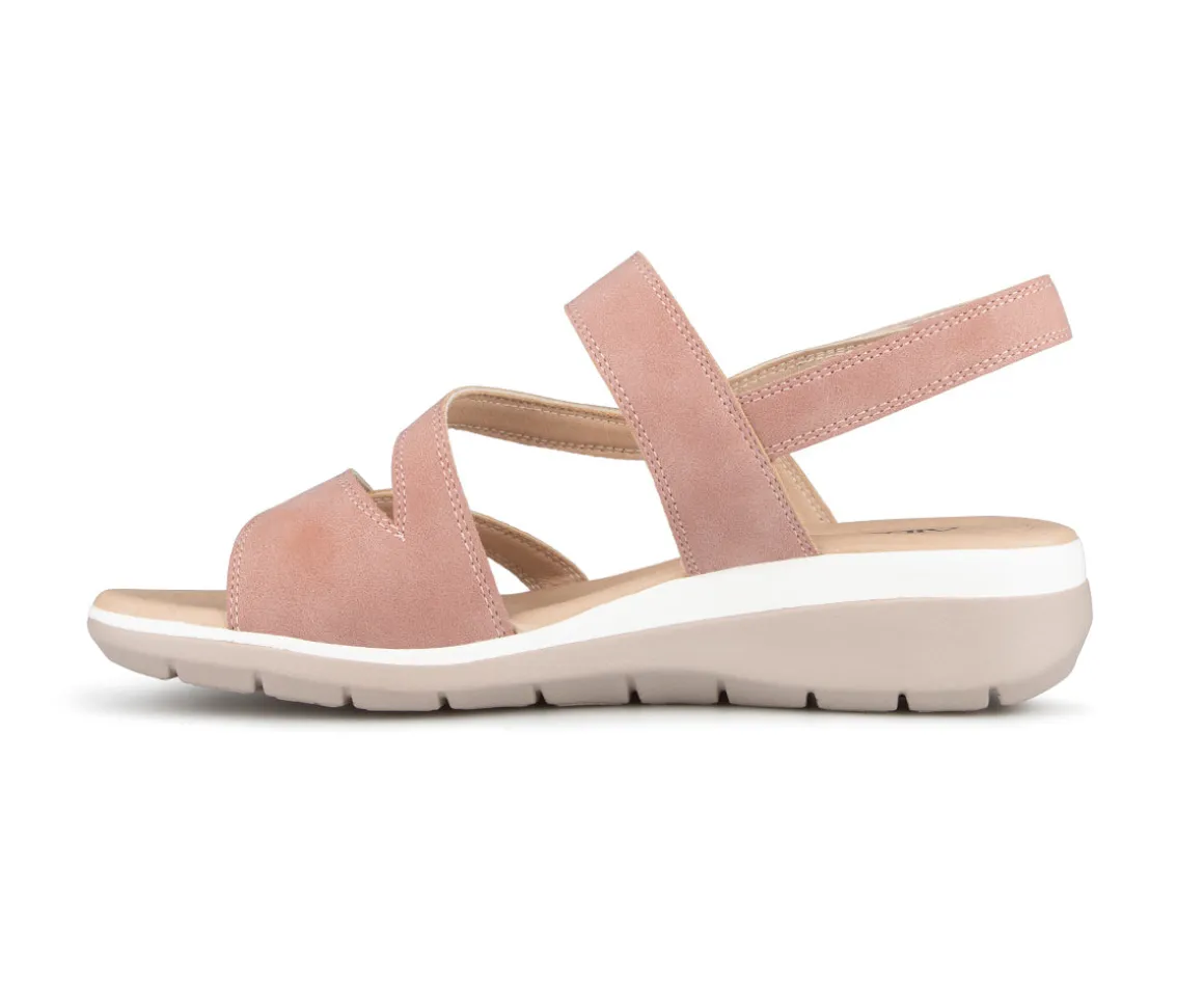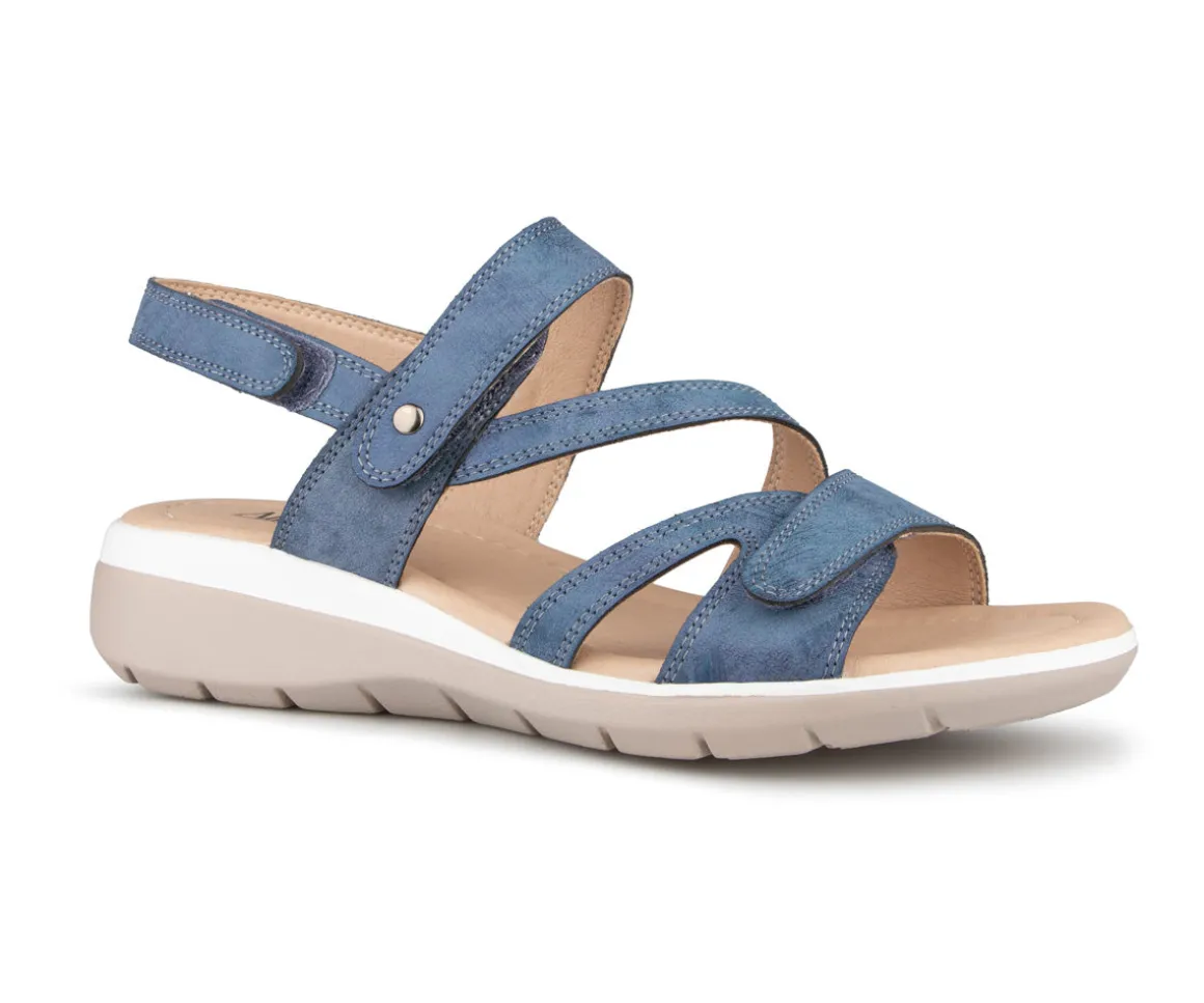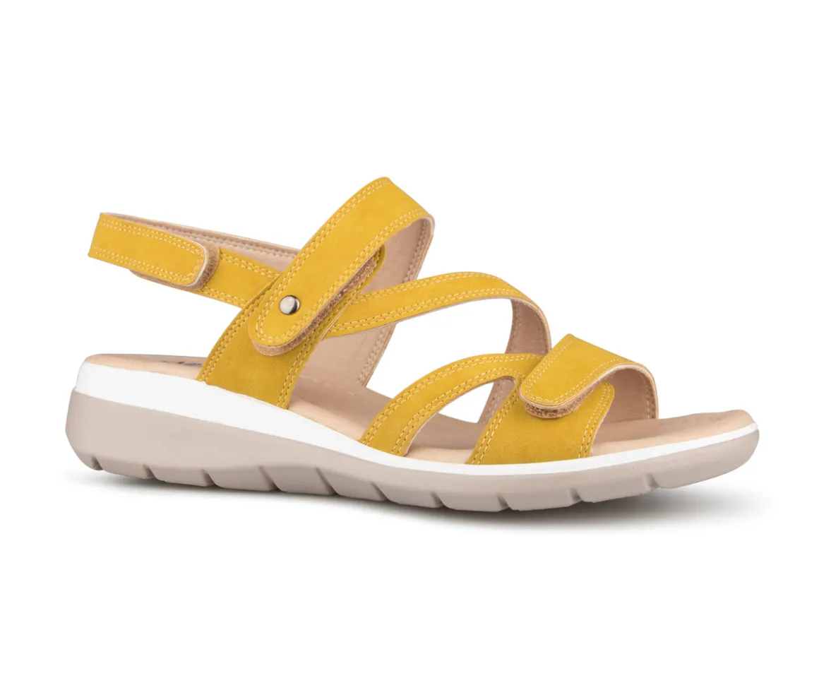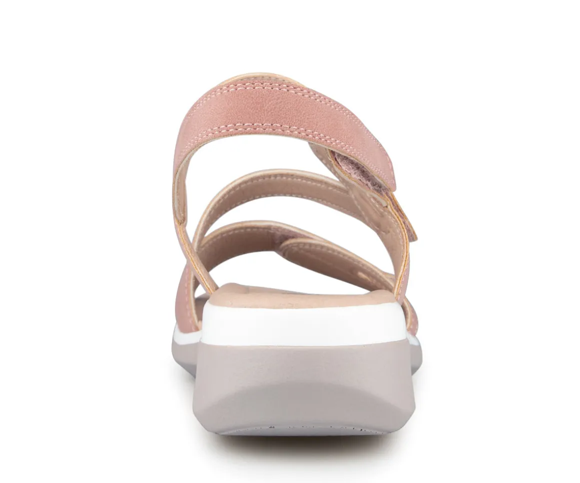 Sandale à talon Alberto pour femme avec talon compensé ainsi que 3 velcros sur l’empeigne. Disponible en 4 couleurs (Bleu, noir, rose et jaune).