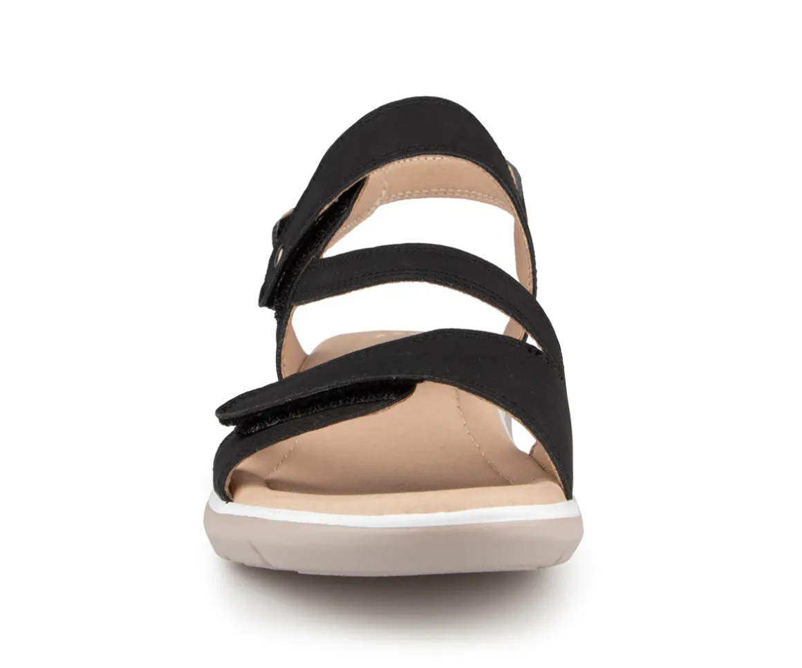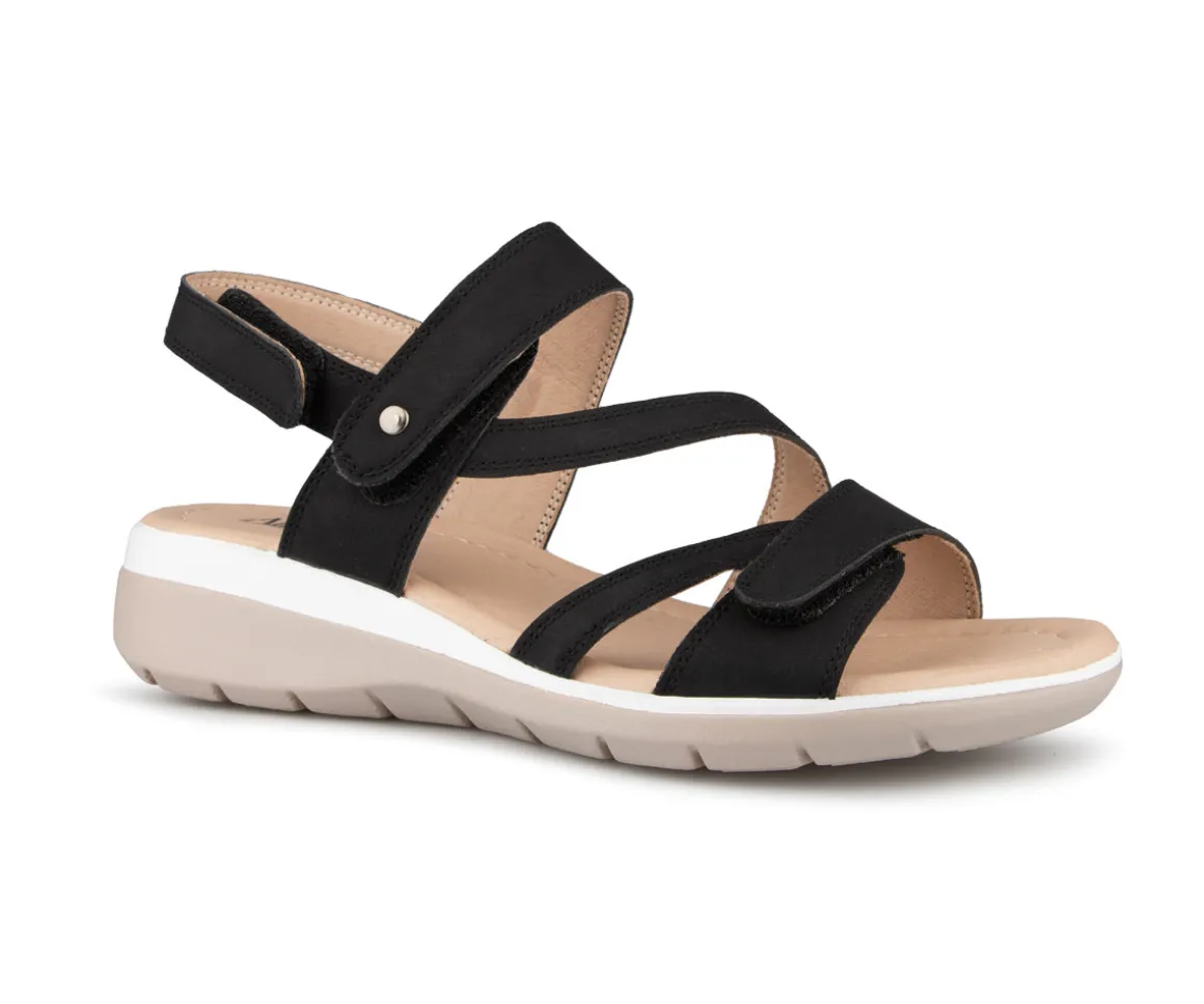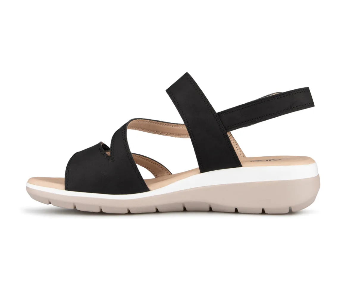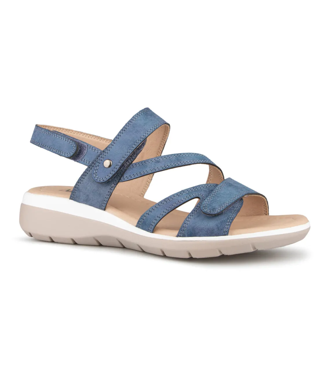Sandale à talon Alberto pour femme avec talon compensé ainsi que 3 velcros sur l’empeigne. Disponible en 4 couleurs (Bleu, noir, rose et jaune).